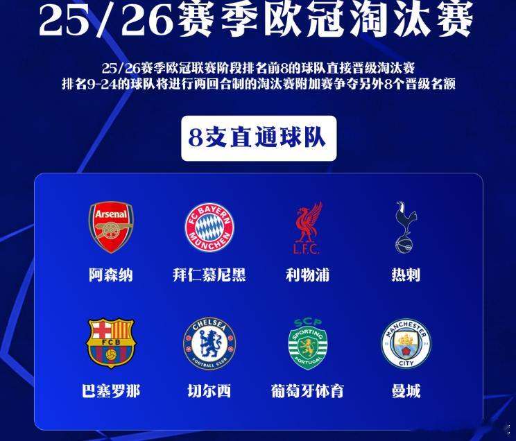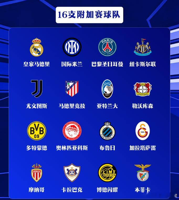 8支直通16强球队:阿森纳、拜仁、利物浦、热刺、巴萨、切尔西、葡萄牙体育、曼城16支附加赛球队:皇马、国米、巴黎、纽卡、尤文、马竞、亚特兰大、勒沃库森、多特蒙德、奥林匹亚科斯、布鲁日、加拉塔萨雷、摩纳哥、卡拉巴克、博德闪耀、本菲卡欧冠