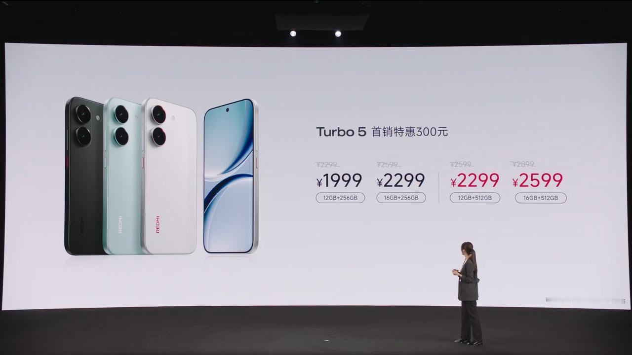 REDMI Turbo 5 正式发布:12+256GB 首销 1999 元(国补 1699.15) 、16+256GB 首销 2299 元(国补 1954.15) 、12+512GB 售价 2299 元(国补 1954.15)、16+512GB 售价 2599 元(国补 2209.15)。 - 芯片:联发科天玑 8500-Ultra 移动处理平台,LPDDR5X Ultra 内存,UFS 4.1 闪存,5300mm² 双阶凸台 LHP 冰封循环冷泵,狂暴引擎; - 屏幕:6.59 英寸 2756×1268 柔性 OLED 直屏,M10 发光材料,手动最高亮度 800nit、全屏激发 2000nit、25% APL 局部激发 3500nit,支持 120Hz 刷新率,480Hz 触控采样率(2560Hz 瞬时触控采样),3840Hz 高频 PWM 调光+类 DC 调光,12bit 色深,支持 HDR 10+、湿手触控; - 相机:前置 20MP(豪威 OV20B,1/4"),后置 50MP 主摄(索尼 LYT-600,1/1.95",OIS)+8MP 超广角(思特威 SC821CS,1/4"); - 续航:7560mAh 小米金沙江电池(硅含量 16%,能量密度 877Wh/L),支持 100W 快充,27W 反向有线充电,支持旁路充电,搭载小米澎湃 G1 电池管理芯片,电池增压芯片,小米澎湃 P3 快充芯片; - 其他:厚 8.18mm,重 204g,祥云白、暗影黑、浅海青 3 款配色,金属中框,2.5D 玻璃后盖,0809 X 轴线性马达,1014D + 1115 双扬声器,支持 NFC、红外遥控,IP66 & IP68 & IP69 & IP69K 防尘防水,Wi-Fi 6,蓝牙 6.0,三频北斗+双频 GPS,光学屏幕指纹,搭载澎湃 OS 3 系统。