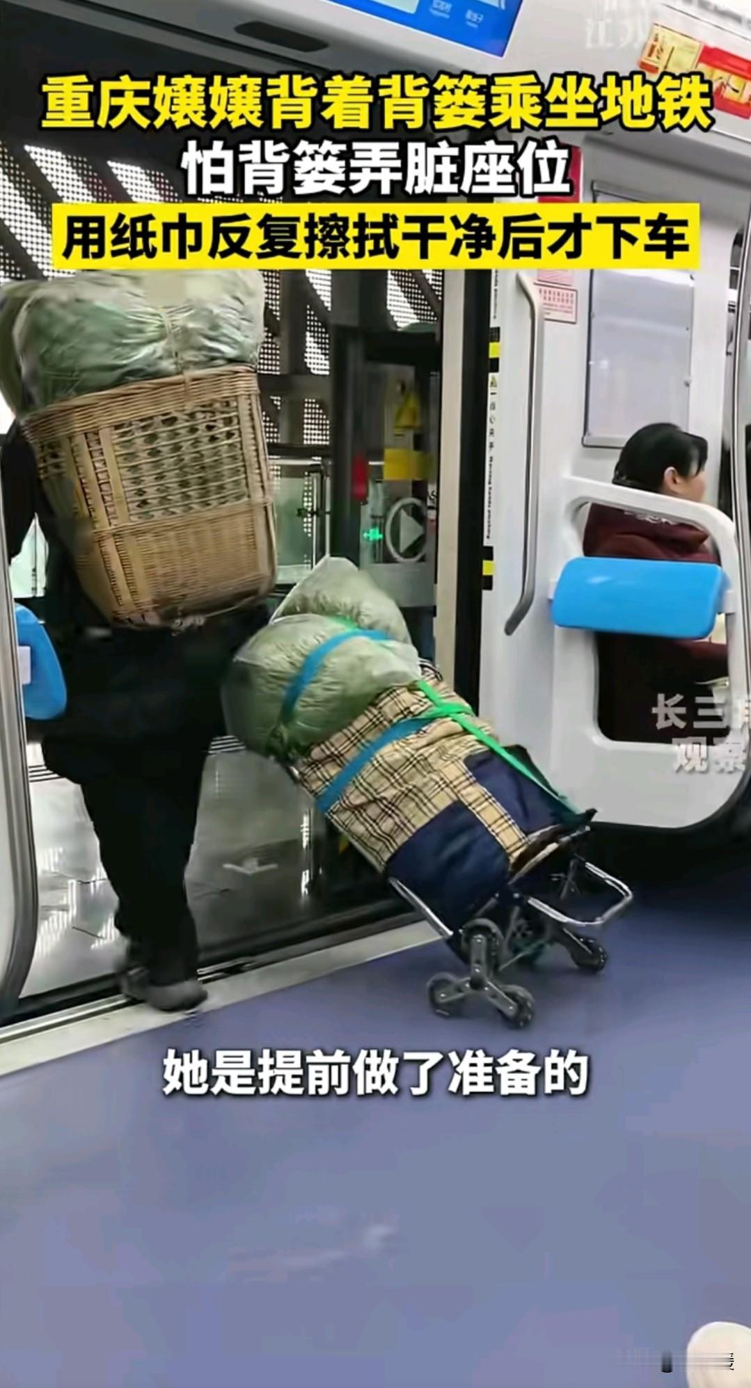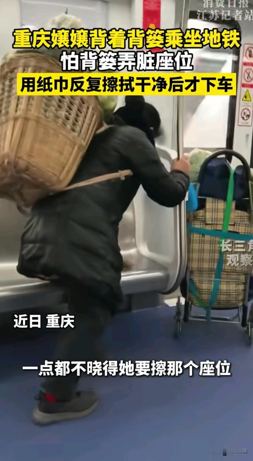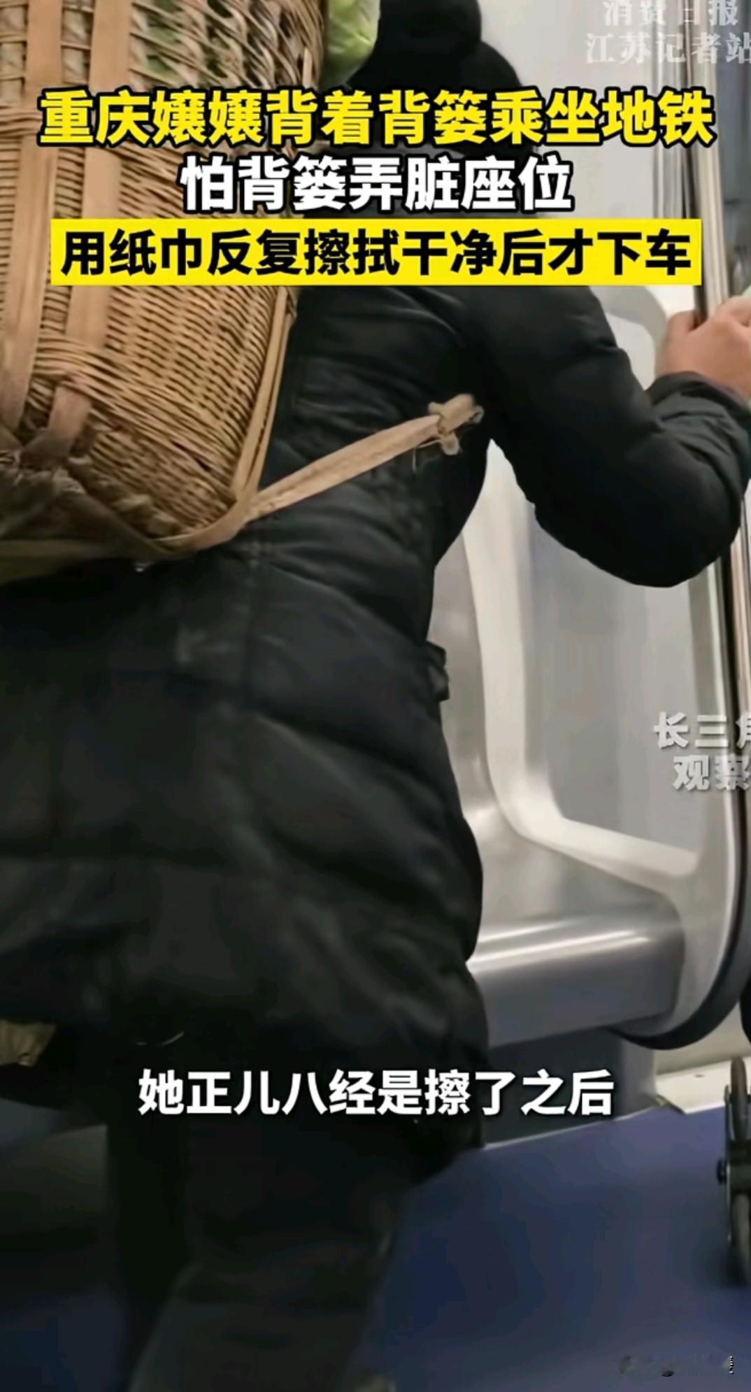 “令人动容的一幕!”重庆,一位阿姨背着背篼坐地铁,快要到站点时,她掐着时间起身,从兜里掏出几张卫生纸,一遍又一遍地擦拭着刚才接触背篼底的座位。 而等座位被擦干净时,地铁刚好到站点,她背着背篼,手里拉着小拖车从容地下了地铁。 不管学历高低,有钱与否,只要一个人足够有素质,他就值得我们每个人从心里去尊敬他,佩服他,而这位阿姨就是其中一位。