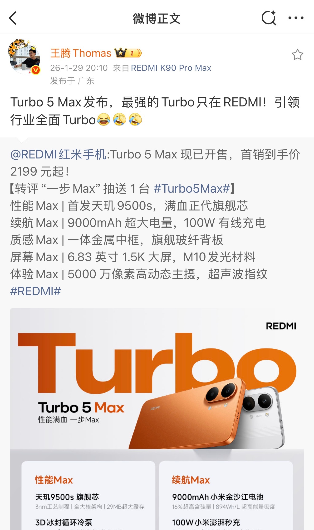 REDMI 前产品经理-王腾,今天又转发REDMI新机 Turbo 5 Max微博,虽然离开REDMI,但是他心系REDMI,并不是和REDMI不相往来,他曾是REDMI的一员猛将,这辈子注定捍卫REDMI,也许这就是江湖