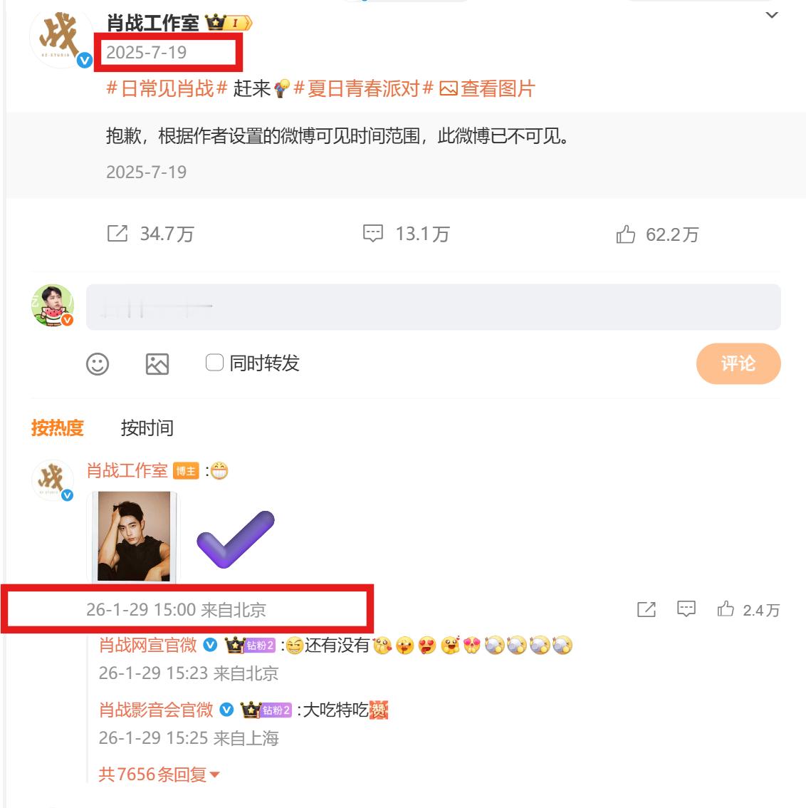 博君一肖 工作室发战战拍立得,据我今天的观察时间顺序是这样的:果园有人刷到了2026年工作室的新春礼盒,大概11点开始陆续有人分享眼尖的龟龟门发现台历上印了一张没见到的战战拍立得然后大家就开着玩笑的艾特工作室,让他交出来同一时间,单超那边没见到有人跟小室要拍立得的结果下午三点,这张拍立得就默默的出现在,小室2025年7月19日,转发战战微博那条的评论区所以,你说小室是看到了哪里的微博决定发的拍立得?小室平时冲浪在哪片海域?