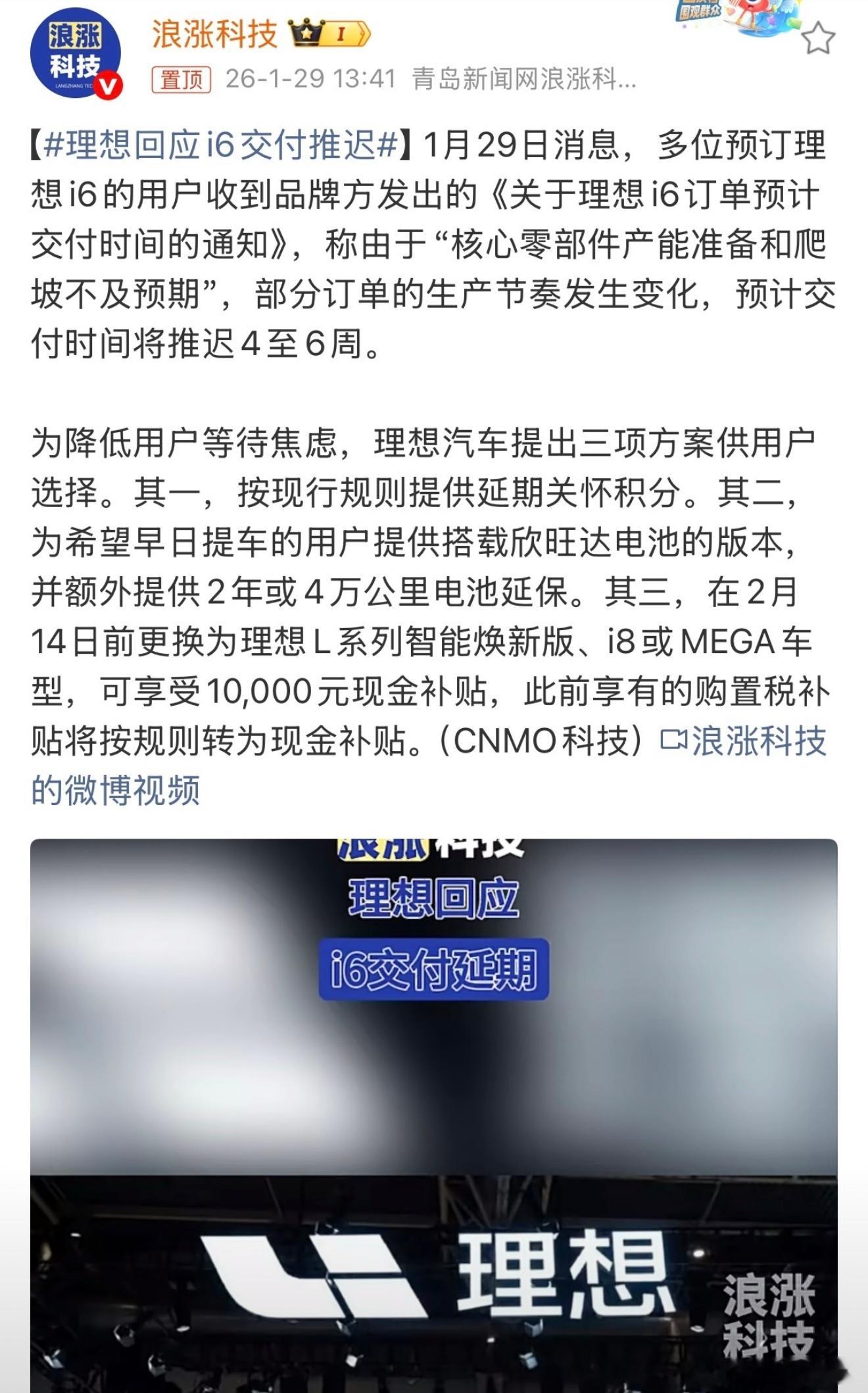 理想i6因为电池供应链出问题,不少订单要推迟交付了,官方今天终于给出了明确回应,没有回避核心问题,也没有找各种借口,直接对不同车主的需求,给了三个积分、延保、现金补贴不同的解决办法,每一项都算是实打实的补偿。供应链问题不是理想一家的事,整个新能源行业都在面对这种不确定性,但出了问题之后,车企的应对速度和解决态度,直接决定了用户的感受。交付延期确实影响了大家的节前用车计划,心里有情绪很正常,但理性来看,理想这次的操作算是及格以上,守住了对用户的基本责任,后续只要能把承诺的都做到位,及时交付、兑现补偿,这份信任就还能找回来,品牌的口碑也不会受太大影响。理想回应i6交付推迟