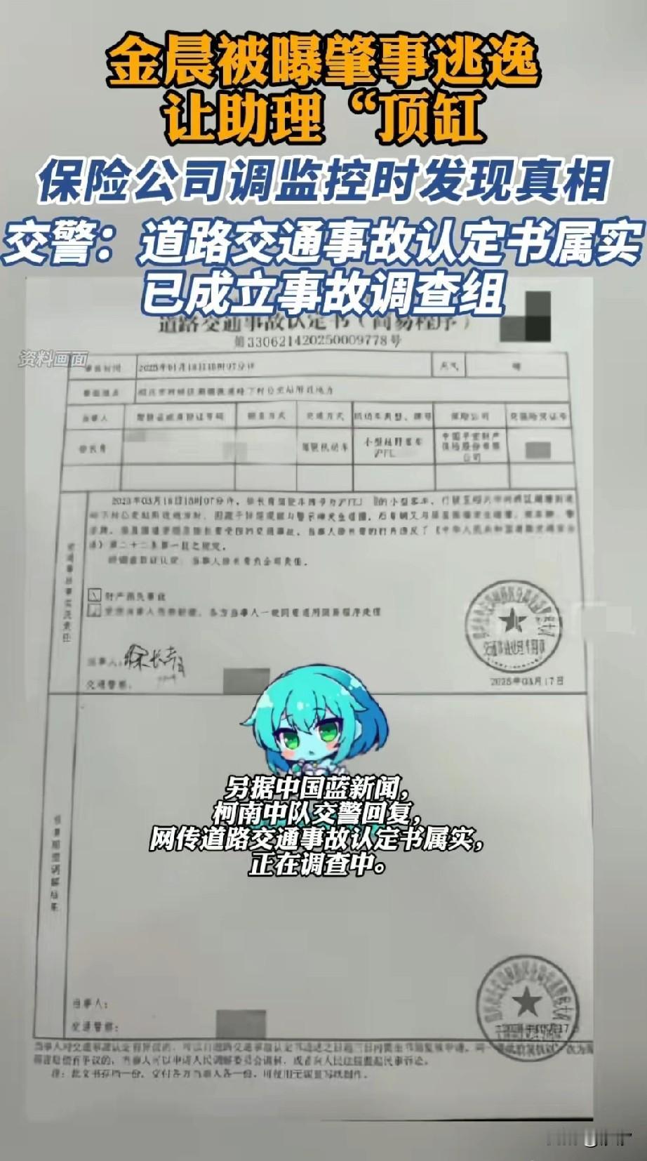万万没想到金晨塌房了, 她被曝肇事逃逸,让助理顶缸, 这事直接冲上了热搜, 而且这事是保险公司调取监控时发现的。 目前已经得到了叔叔的确认, 正在调查当中, 这么知名的影视演员, 闯祸之后居然让助理顶包, 这是要赤裸裸的逃避法律的制裁, 明星只是一种职业并不是特权, 希望金晨能够明白, 有知情人士透露, 这是发生在2025年的3月16号, 知名演员金晨在浙江省绍兴市柯桥区发生交通事故,涉嫌交通肇事逃逸罪, 在事故处理结束后, 保险公司在理赔调查阶段, 调取了交警的监控视频, 发现肇事司机并非许长青, 而是车主金晨车主本人, 随后立刻向交警部门报警, 她也没有想到自己通过手段, 已经要逃脱法律的制裁了, 结果却在保险赔偿这一块出了问题, 于是这事直接被翻了出来, 舆论压力之下谁也保不了她, 毕竟这么多双眼睛盯着她, 而金晨也在节目中说过自己非常喜欢开车,在拍戏的过程中居然还逆行了, 真怀疑她的驾照是通过花钱买来的, 一个连交通规则想都不懂的人居然喜欢开车,那出事故是早晚的事, 这样的马路女杀手真的相当可怕, 尤其是知名女演员更加放纵, 大家都知道现实中交通事故非常惨烈, 有些女生确实不适合开车真的不要勉强。 金晨这次被曝出来恐怕要牵扯很多人,毕竟交通监控视频可不会造假! 大家觉得金晨这次会不会彻底凉凉? 金晨曝金晨肇事逃逸 金晨身材好绝 金晨跳舞 金晨红毯造型 金晨综艺