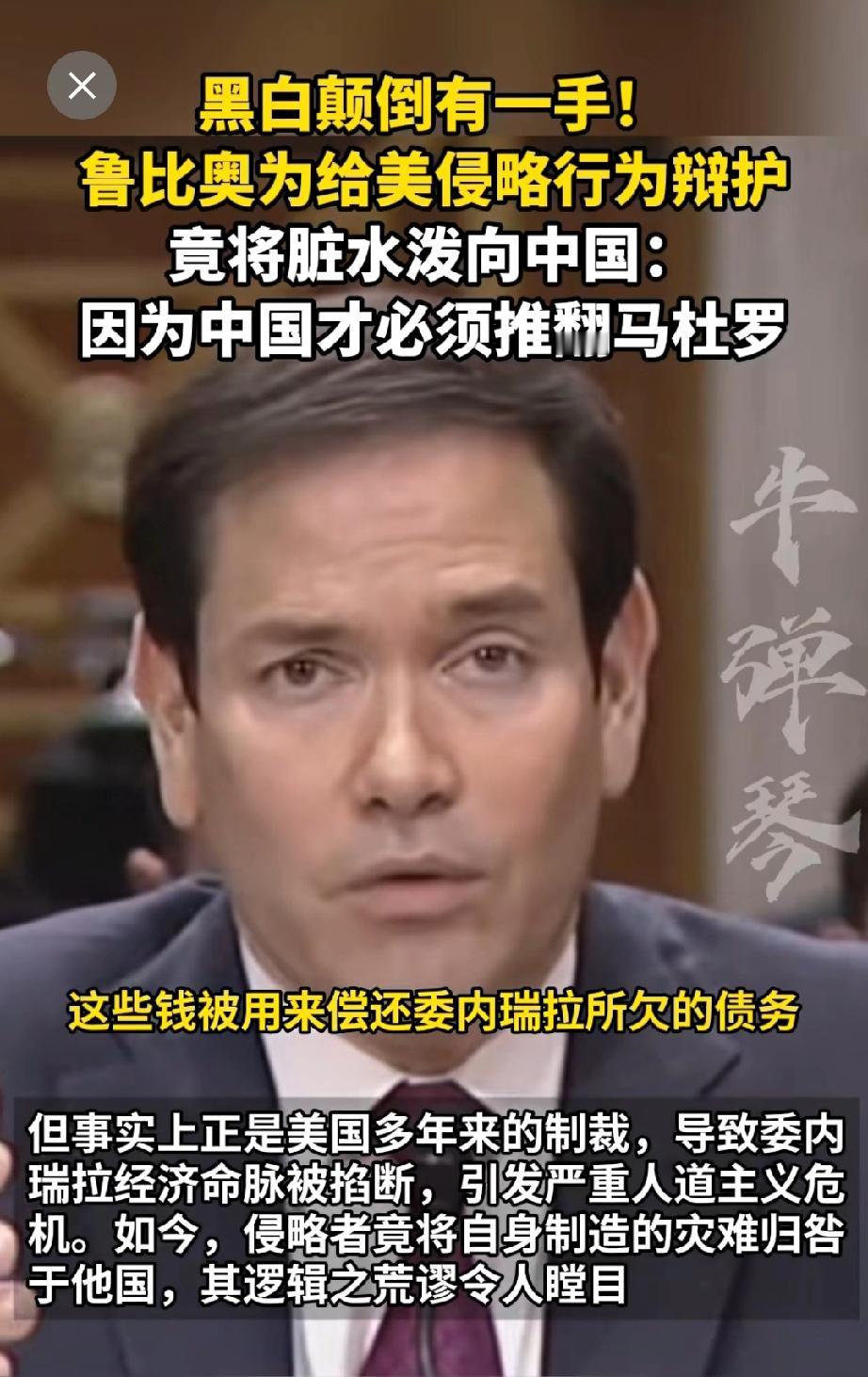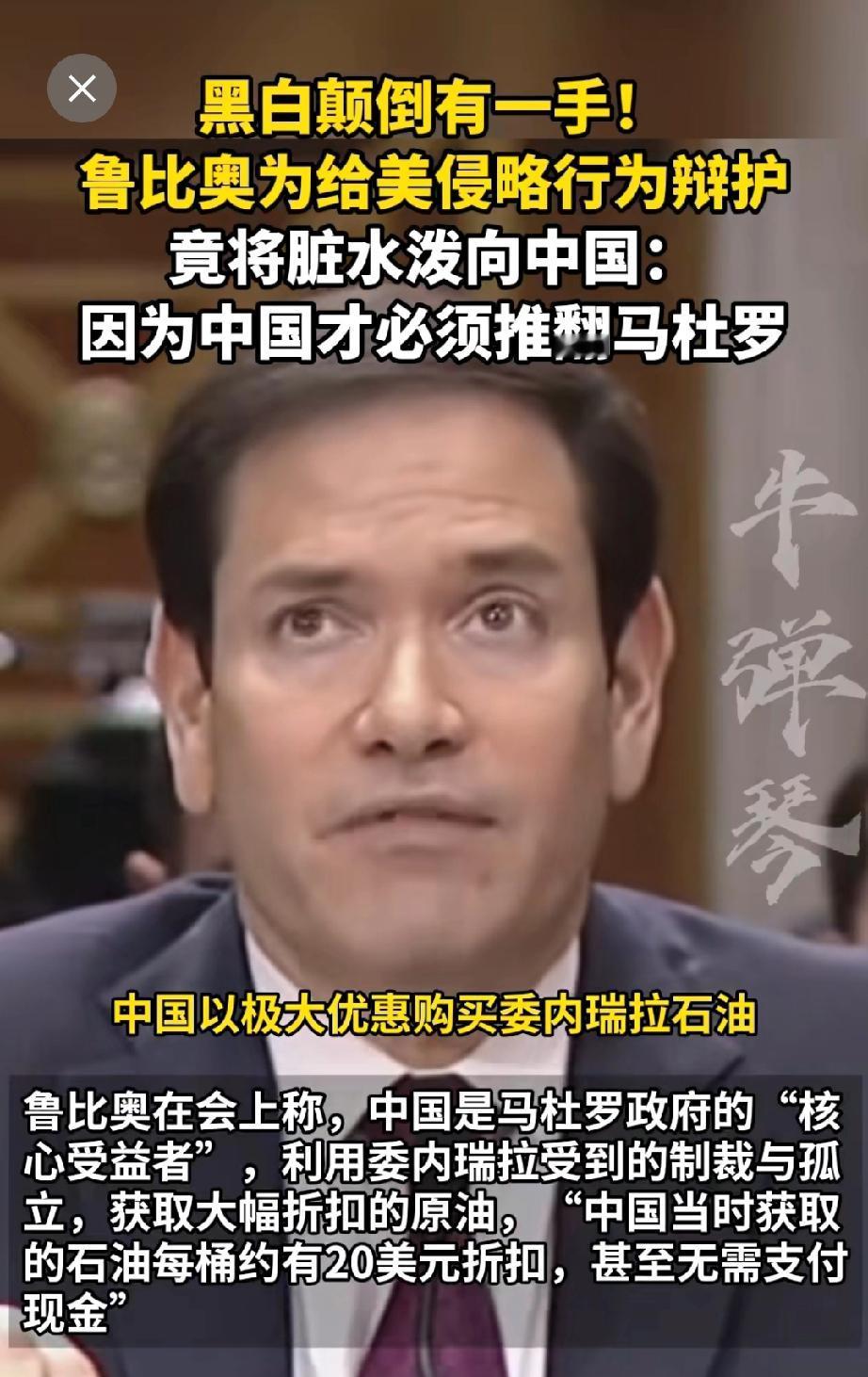鲁比奥的老毛病又犯了。 他可是泼中国脏水不可多得的“天才”,他的嘴是专门用来放屁和喷粪的,黑白颠倒更是有一手!他说:因为中国才必须推翻马杜罗。 反正现在美国现在除了拿中国说事,其它就没有什么说了。特朗普所做的一切目的很明显,就是要围堵中国,就是要断中国的经济和能源命脉。真是不要脸,自己侵略别国,还甩锅别人,到了厚脸颜无耻的地步,无可救药了 中国购买委内瑞拉石油,不管价格如何便宜,与你美国没有任何关系,管的太宽了吧。 我相信,未来五到十年,美国还会疯狂的围堵,只要和中国交好的都会遭殃,美帝亡我之心不死,我们必须时刻保持清醒的头脑。