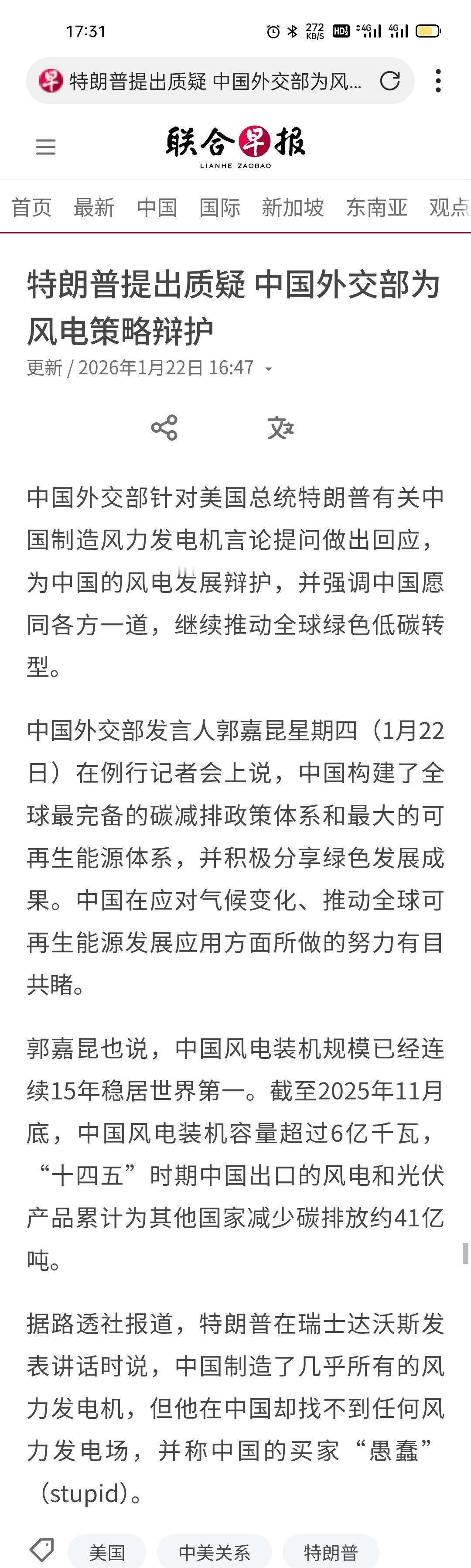 川普说「中国制造了几乎所有风力发电设备,自己却没安装」,真实情况如何?你怎么看? 刚才在一向不问事实就转发的联合早报上看到的文章。 ------------------------------------ 现在连江西这种内陆,是个高点的山,上面就有风力发电机。