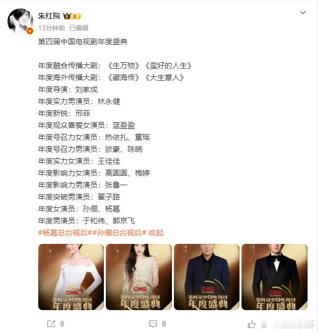 第四届中国电视剧年度盛典获奖名单第四届电视剧年度盛典获奖名单年度女演员:孙俪、杨幂;年度男演员:于和伟、郭京飞 ;《生万物》收获7个奖项!