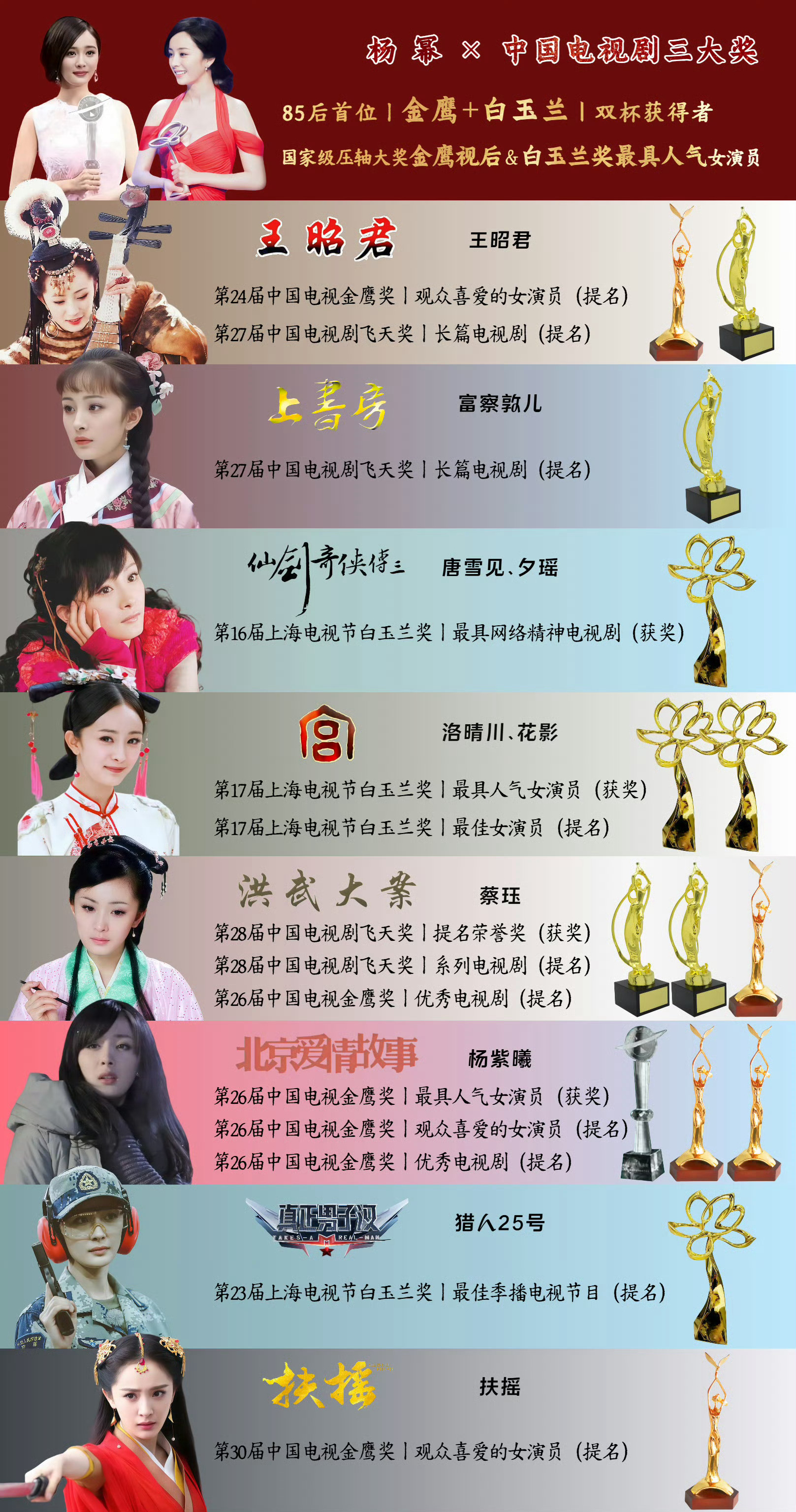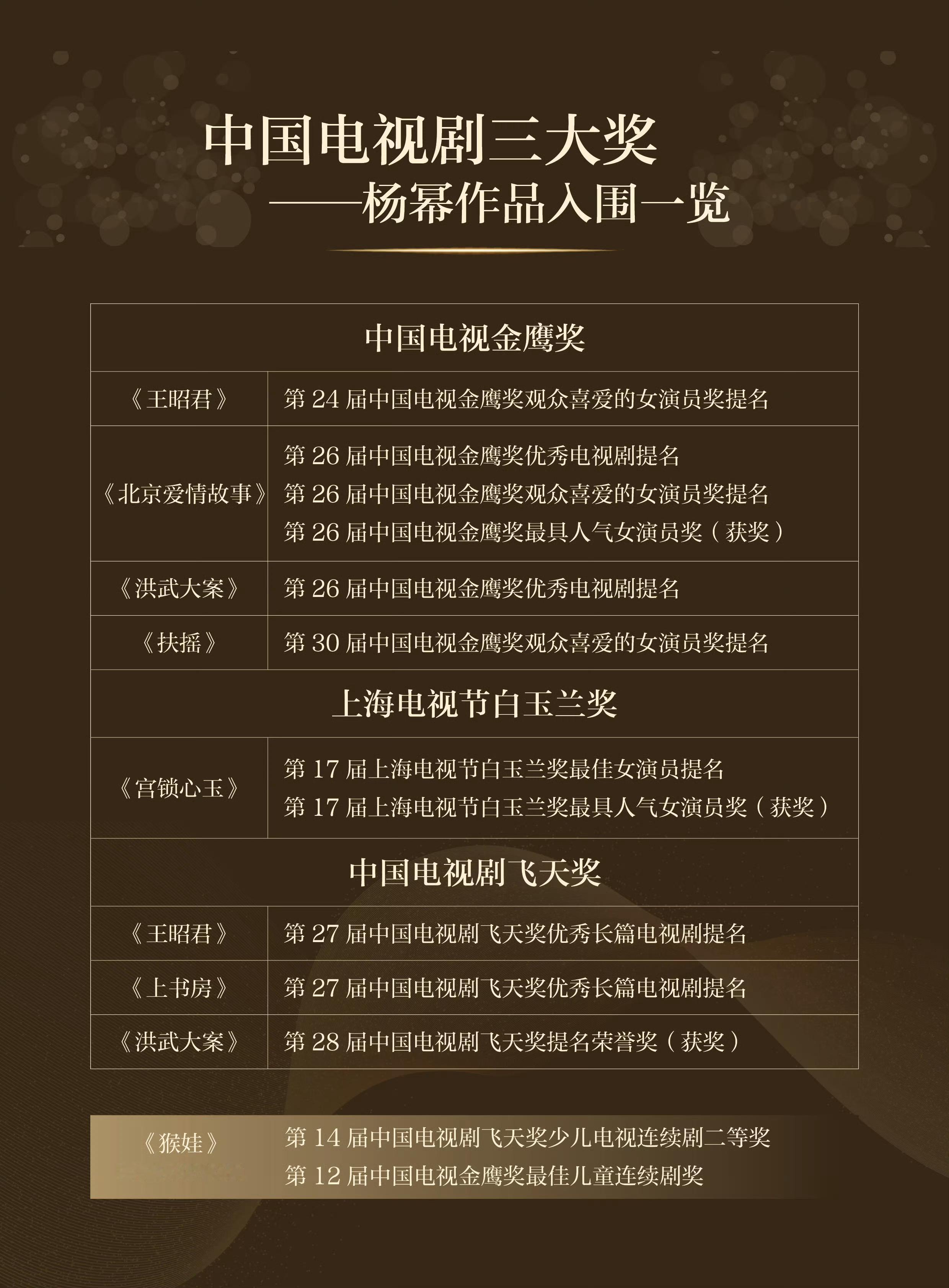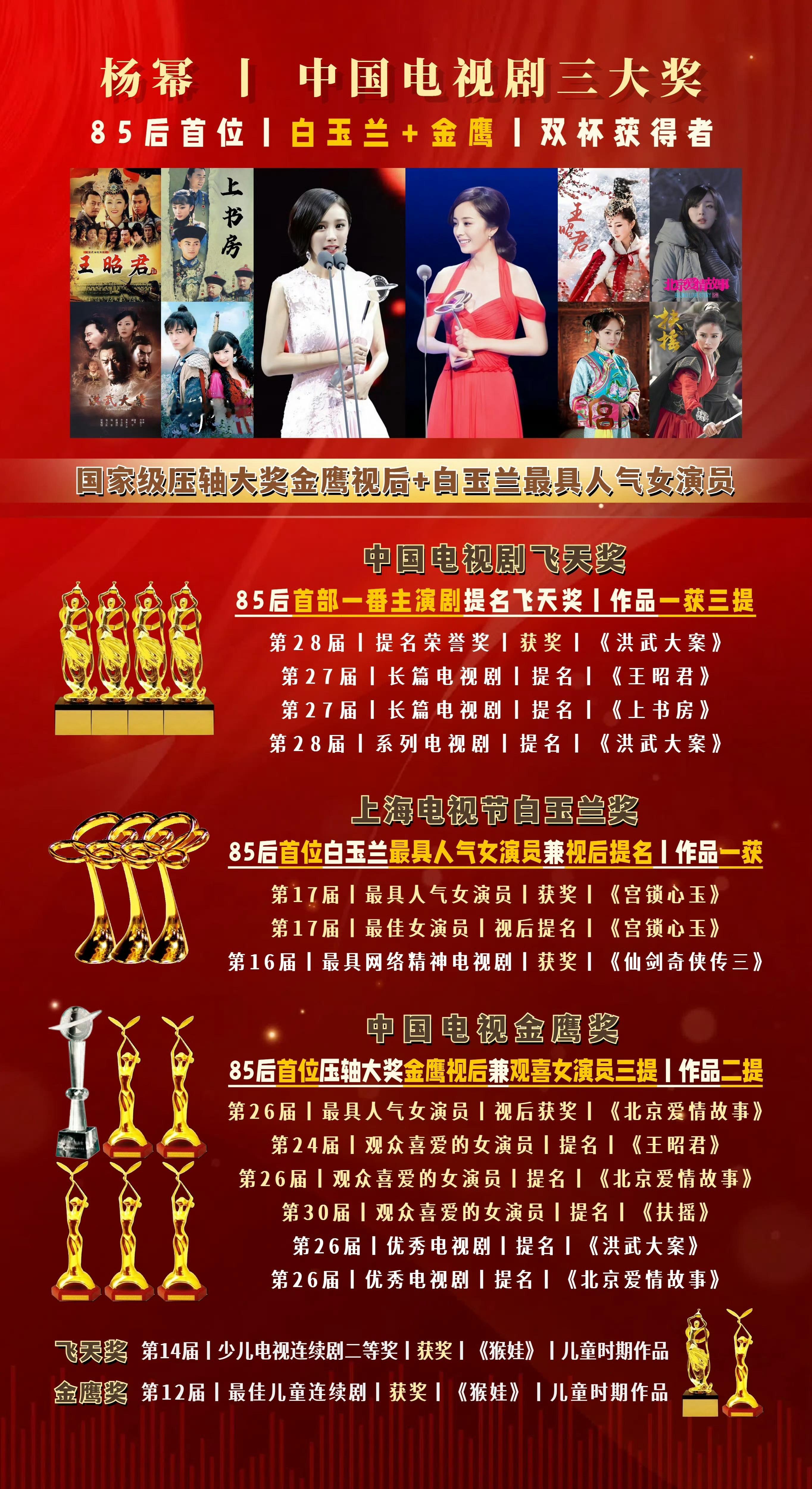 杨幂金鹰视后+总台视后,双料视后获得者杨幂金鹰视后+白玉兰最具人气,双杯获得者2011《宫》洛晴川——白玉兰奖最具人气女演员2012《北京爱情故事》杨紫曦(原声)——金鹰视后2026《生万物》宁绣绣(原声)——CMG总台视后一步一个脚印不停向前走的演员杨幂,主流大奖履历越来越丰富,宁绣绣也迎来了她的丰收季,加油,这只是起点!杨幂总台视后