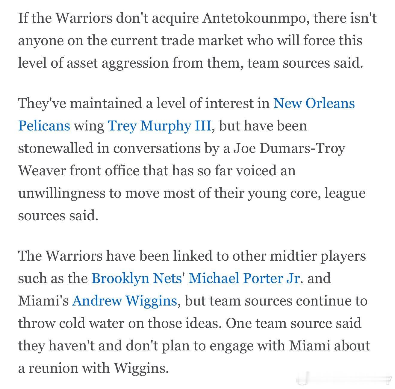 球队消息人士表示,如果勇士无法得到字母哥,在当前的交易市场上,不存在任何一名球员值得勇士动用如此激进级别筹码。消息称,勇士确实一直对特雷墨菲保持兴趣,但双方在谈判中遭遇阻力,鹈鹕乔杜马斯与特洛伊韦弗领导的管理层目前明确不愿意拆散球队大部分年轻核心。此外,勇士也曾被中档级别球员联系在一起,比如篮网的迈克尔波特以及维金斯,但球队内部消息持续对这些传闻泼冷水。一位球队消息人士直言,勇士既没有、也不打算就维金斯回归一事与热火展开接触。
