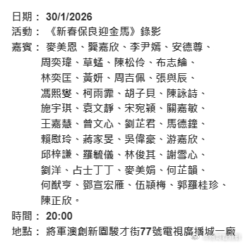 《新春保良迎金馬》錄影.司仪阵容:麥美恩、龔嘉欣、李尹嫣、安德尊、周奕瑋、演出阵容:草蜢、陳松伶、布志綸、林奕匡、黃妍、周吉佩、張與辰、馮熙燮、柯雨霏、胡子貝、陳詠詩、施宇琪、袁文靜、宋宛穎、關嘉敏、王嘉慧、曾文心、劉芷君、馬德鐘、賴慰玲、蔣家旻、吳偉豪、游嘉欣、邱梓謙、羅毓儀、林俊其、謝雪心、劉洋、占士丁丁TVB