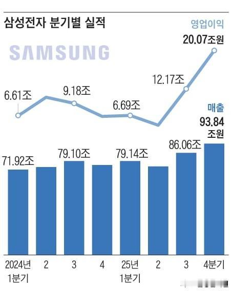 韩媒:三星电子半导体去年第四季度营业利润达 16 万 4,000 亿韩元,为前一年的 5.6 倍 ¬ 半导体营业利润 16 万亿 … 带动好业绩,今年全年营业利润有望实现最高 180 万亿 三星电子回归了。 三星电子 29 日透露,去年第四季度(10-12月)销售额为 93 万 8,374 亿韩元(人民币约 4,560 亿元),较前一年增长了 23.8%;营业利润为 20 万 0,737 亿韩元(人民币约 976 亿元),增长了 209.2%。以第四季度为准,这是 7 年来最高的营业利润,季度销售额和营业利润均创下韩国企业史上最高纪录。 半导体业务收入同比增长 46.2%,达到 44 万亿韩元(人民币约 2,138 亿元),营业利润增长 465%,达到 16 万 4,000 亿韩元(人民币约 797 亿元)。一度因判断失误而错失的高带宽存储器(HBM)的竞争力已彻底得到恢复,为夺回被 SK 海力士抢占的"半导体王座"奠定了基础。去年全年销售额同比增长 10.87%,达到 333 万 6,000 亿韩元(人民币约 1 万 6,213 亿元),年营业利润增长 33.3%,达到 43 万 6,000 亿韩元(人民币约 2,119 亿元)。 带动三星电子取得佳绩的依然是半导体事业部(DS),半导体业务占整体营业利润的 80%。 此前,三星电子的存储芯片业务一直是名副其实的行业第一。但随着人工智能(AI)基础设施竞争的加速,三星在 HBM 开发上落于人后,从 2025 年第一季度开始被SK海力士超越。市场调查机构 Counterpoint Research 的数据显示,2024 年第四季度,三星电子在 DRAM 市场的份额为 38%,保持第一,但在去年第一季度,其市场份额下降到 34%,落后于 SK 海力士(36%)。 三星电子通过重新设计 HBM 这一重大举措,致力于恢复技术竞争力,后来向英伟达供应 HBM3E,以寻求逆转的机会。去年,三星电子还向谷歌和 AMD 供应了 HBM3E。最近,三星电子完成了 HBM4 的开发,实现了业界最高水平的 11.7Gbps 运行速度,宣布从下个月开始正式向英伟达供货。随着三星电子的 HBM 技术竞争力得以回复,三星电子还夺回了去年第四季度拱手让给 SK 海力士的 DRAM 冠军(按销售额计算)的位置。科技行业相关人士表示:"一度停滞的三星电子半导体业务重新开始发力。目前全球出现内存供应不足的现象,有望直接惠及生产能力强大的三星电子"。 科技界预测称,由于半导体市场的繁荣,今年三星电子的年营业利润将达到最高的 180 万亿韩元(人民币约 8,748 亿元)。SK 证券表示:"预计今年三星电子的营业利润将比前一年增长 314%,达到 180 万亿韩元,营业利润率为 37%,在利润和收益性方面均创下历史新高"。 相反,三星电子的家电和智能手机业务正面临困境。去年第四季度,三星电子移动和网络业务部的营业利润比前一年下降,只有 1 万 9,000 亿韩元(人民币约 92 亿元),而家电和电视业务继第三季度之后,连续两个季度出现亏损。 来源:朝鲜日报