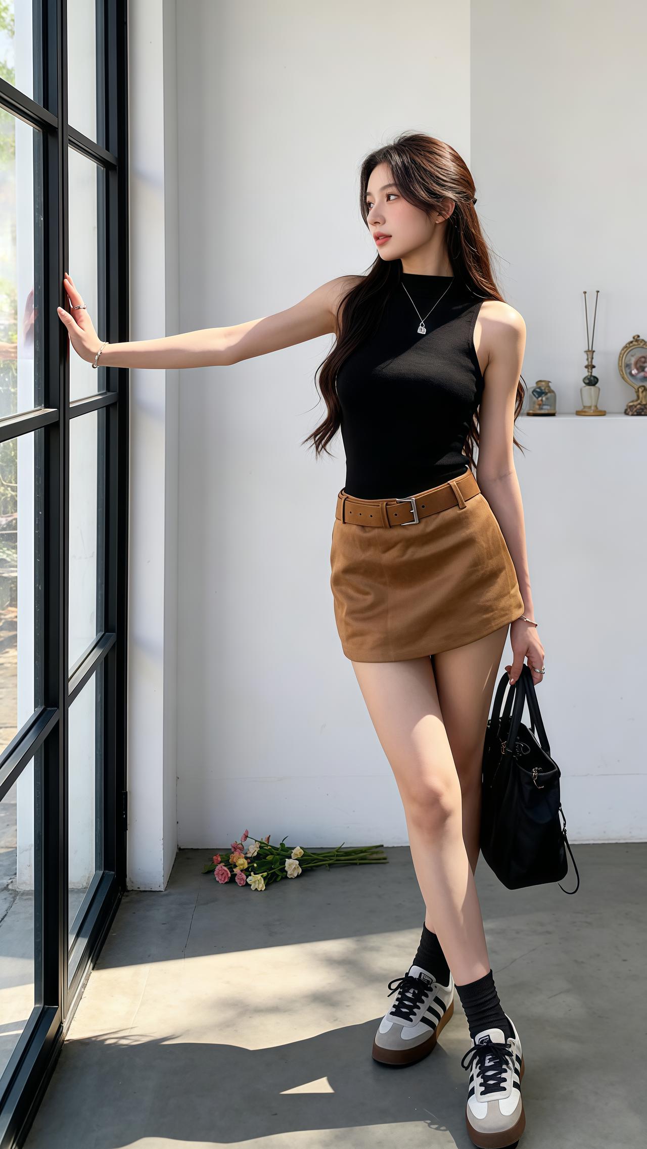 这套穿搭直接封神!米色针织衫+黑皮裤,一松一紧超显瘦侧身屈膝轻触脚踝,