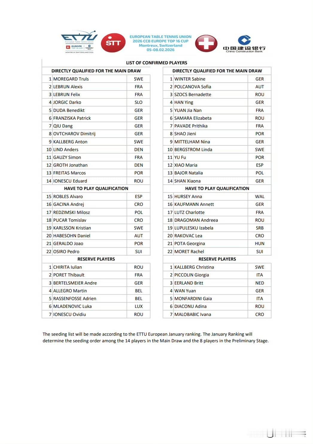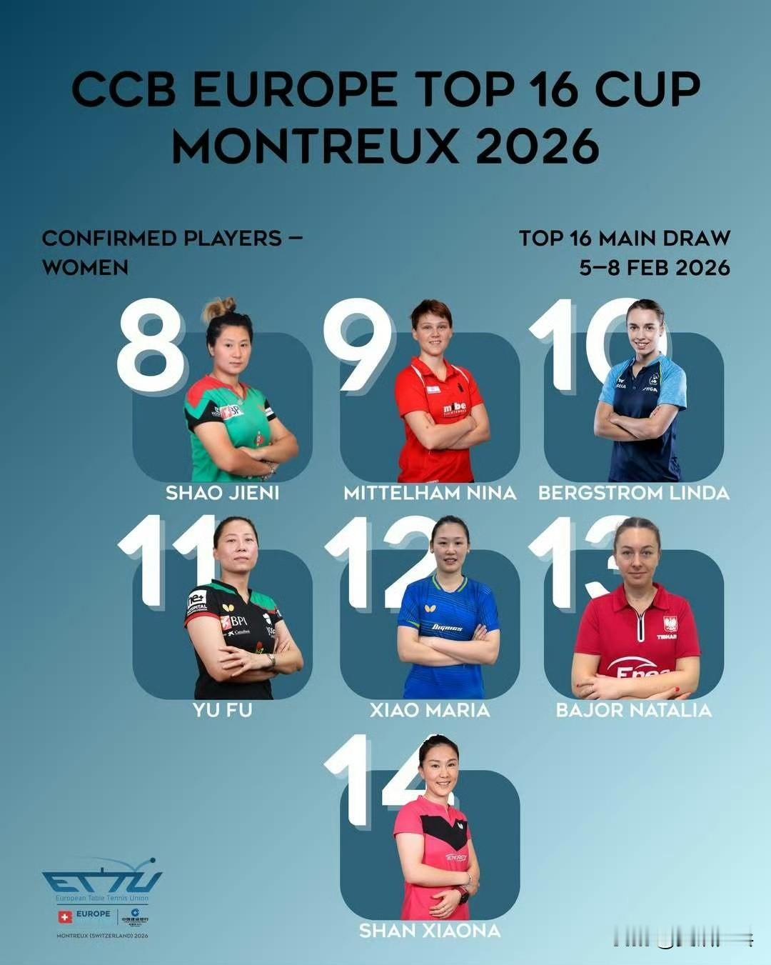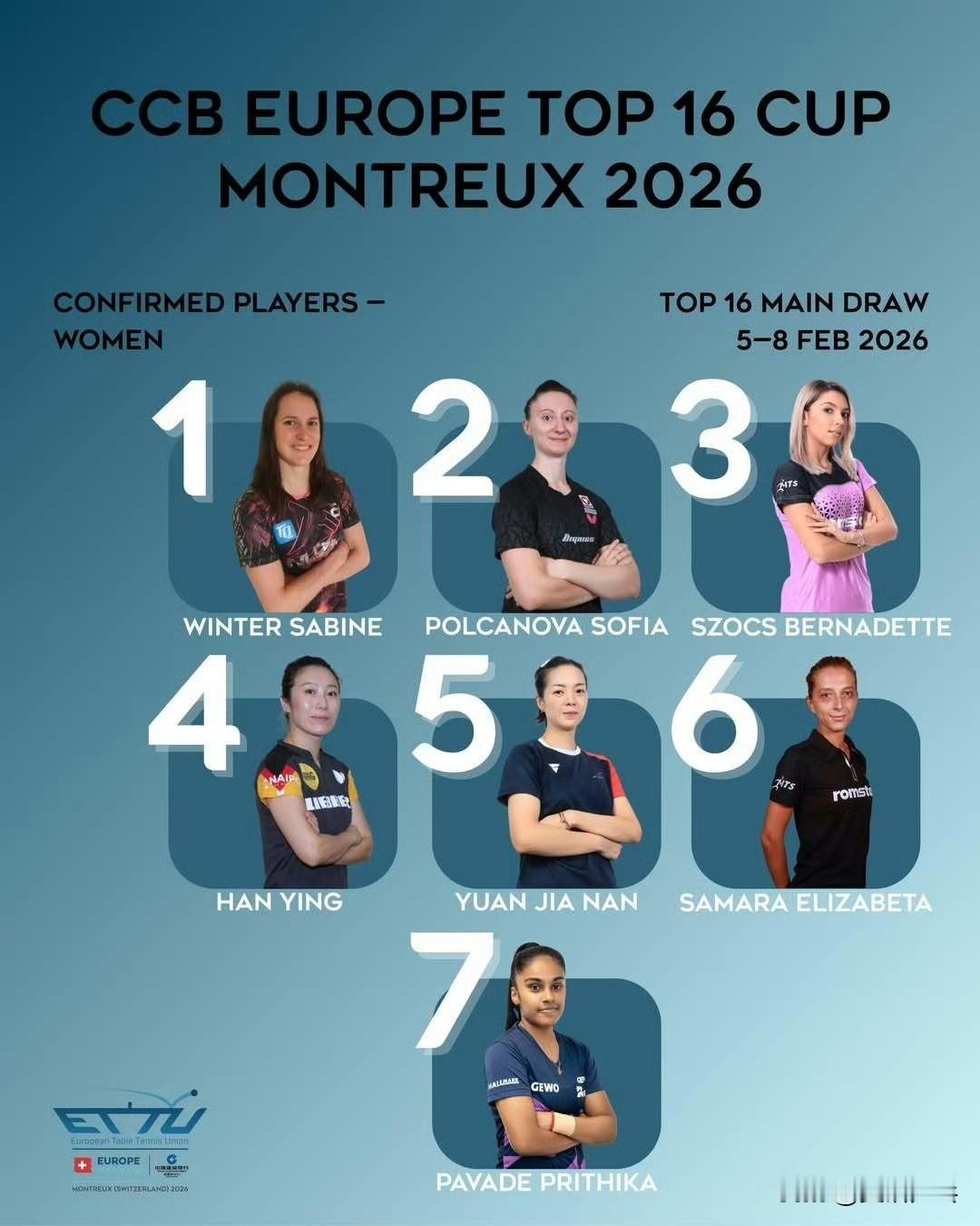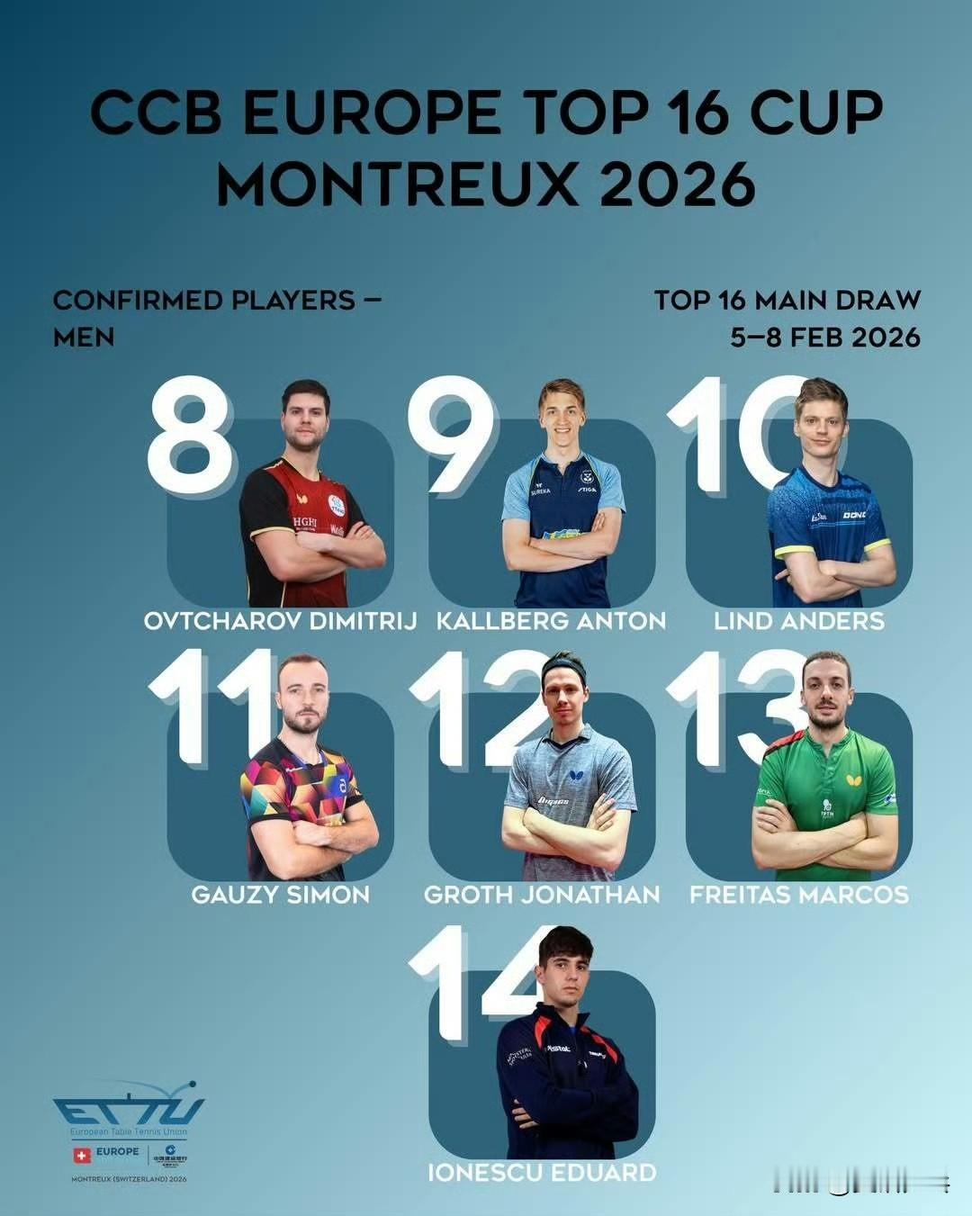 2026欧洲十六强杯赛丨赛事信息 【比赛时间】2.5-2.8丨蒙特勒·瑞士🇨🇭 【参赛名单】 男单正赛丨特鲁斯·莫雷加德🇸🇪、艾利克斯·勒布伦🇫🇷、费利克斯·勒布伦🇫🇷、达科·约奇克🇸🇮、贝内迪克特·杜达🇩🇪、帕特里克·弗朗西斯卡🇩🇪、邱党🇩🇪、迪米特里·奥恰洛夫🇩🇪、安东·卡尔伯格🇸🇪、安德斯·林德🇩🇰、西蒙·高茨🇫🇷、约纳坦·格罗特🇩🇰、马科斯·弗雷塔斯🇵🇹、爱德华·约内斯库🇷🇴 女单正赛丨莎宾·温特🇩🇪、索菲亚·波尔卡诺娃🇦🇹、伯纳黛特·斯佐克斯🇷🇴、韩莹🇩🇪、袁嘉楠🇫🇷、伊莉莎贝塔·萨马拉🇷🇴、普莉蒂卡·帕瓦德🇫🇷、邵杰妮🇵🇹、尼娜·米特兰姆🇩🇪、琳达·伯格斯特隆🇸🇪、付玉🇵🇹、肖瑶茜🇪🇸、娜塔莉亚·巴约🇵🇱、单晓娜🇩🇪 男单预赛丨阿尔瓦罗·罗伯勒斯🇪🇸、安德烈·加奇尼🇭🇷、米洛什·雷德齐姆斯基🇵🇱、托米斯拉夫·普卡🇭🇷、克里斯蒂安·卡尔森🇸🇪、丹尼尔·哈贝松🇦🇹、若奥·格拉尔多🇵🇹、佩德罗·奥西罗🇨🇭 女单预赛丨安娜·赫西🏴、安妮特·考夫蔓🇩🇪、夏洛特·卢茨🇫🇷、安德烈娅·德拉戈曼🇷🇴、伊萨贝拉·卢普雷斯库🇷🇸、莉娅·拉科瓦奇🇭🇷、乔吉娜·波塔🇭🇺、蕾切尔·莫雷特🇨🇭 【赛制】分为预赛和正赛两个阶段 8名选手参加预赛进行8强淘汰赛,半决赛的2位胜者晋级正赛;正赛为16强淘汰赛,所有比赛将采用五局三胜制