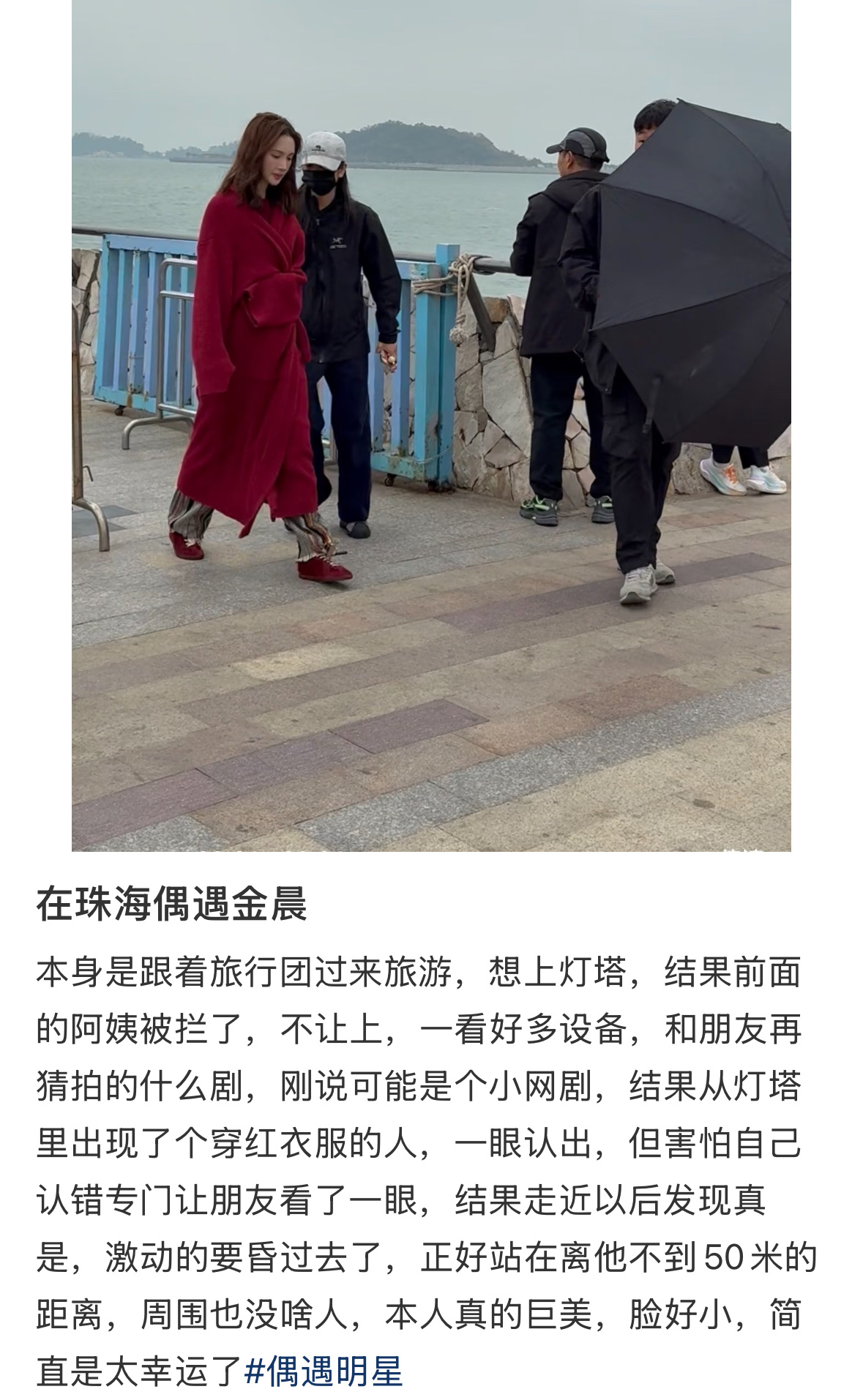 曝金晨没有任何公关的机会有网友在珠海偶遇金晨,旁边的小助理穿的始祖鸟,出事那天被爆的照片也是穿的始祖鸟曝金晨交通事故监控截图