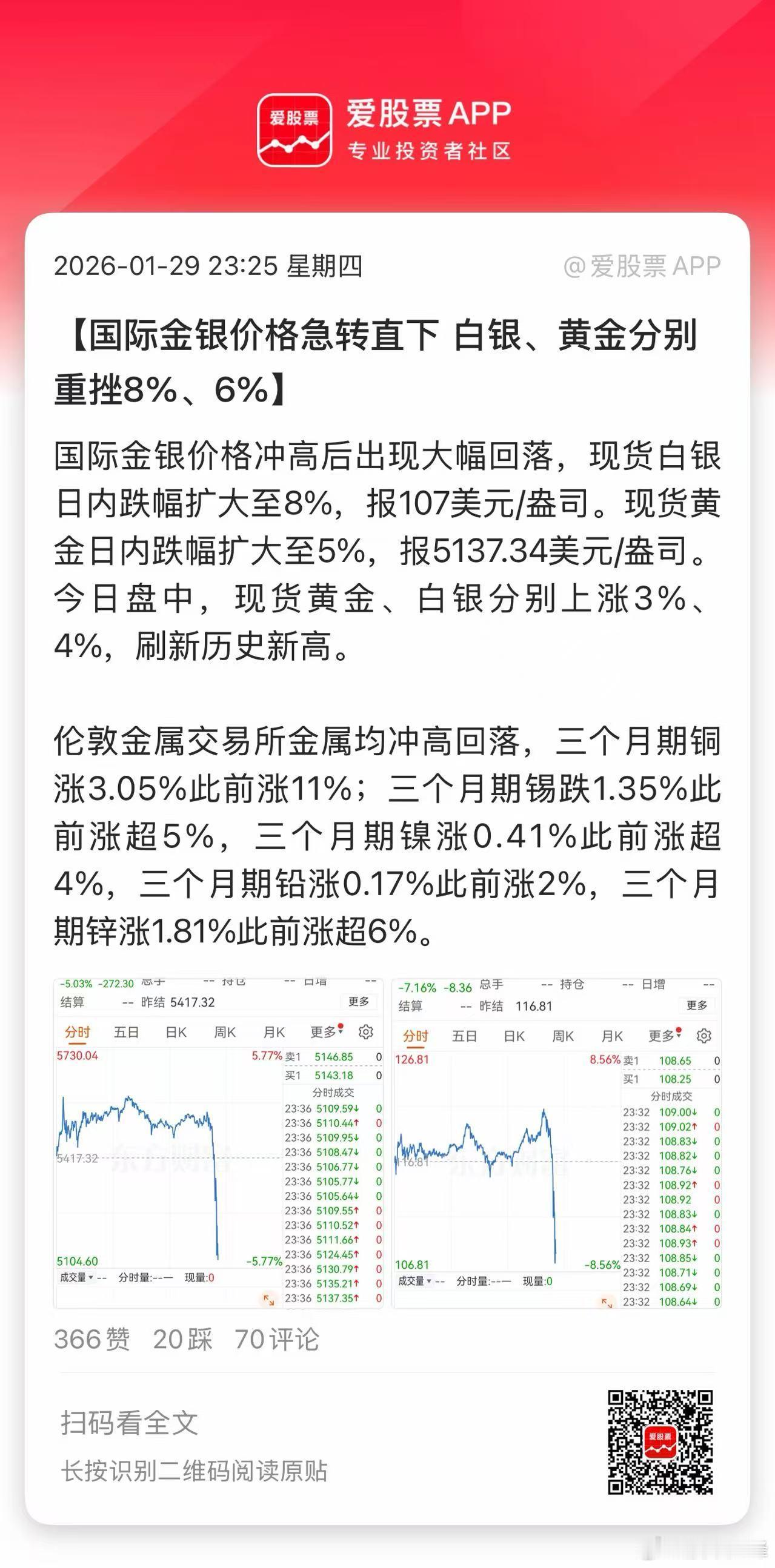 今晚大宗商品一度狂飙,黄金、白银、铜、石油统统大涨。但刚刚突然全线大跳水,现货白银-8%,现货黄金-5%,这有点疯狂了!村里也在继续降温,多只原油产品在晚间发布停牌公告,明天停牌一小时!国投白银LOF公告:本基金将于1月30日开市起停牌至收市。这么看来是保护投资者了。本周资源股绝对主升浪,有点像1月初的商业航天,热的一塌糊涂!明天黄金股和有色股危险了,白酒等老登股和券商股可能继续护盘!现在市场变的很快,昨天大家做个黄金矿工,今早就想做AI人,下午只想做个酒鬼。晚上拿着有色、科技的估计睡不着了,这真有点难搞啊。(爱股君)
