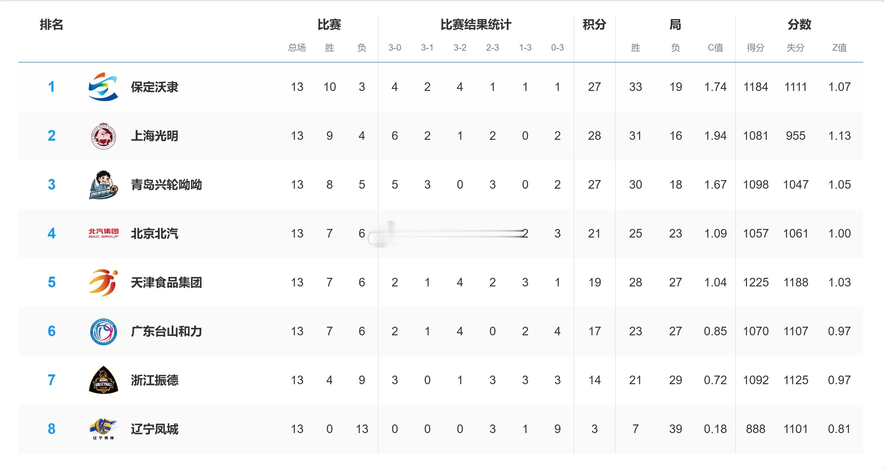【积分榜】2025-2026中国男排超级联赛常规赛A级第13轮后积分榜河北保定沃隶:27分(10胜3负)上海光明:28分(9胜4负)山东青岛兴轮呦呦:27分(8胜5负)北京北汽:21分(7胜6负)天津食品集团:19分(7胜6负)广东台山和力:17分(7胜6负)浙江振德:14分(4胜9负)赛中升降赛辽宁凤城凤凰山:3分(13负)赛中升降赛清松带你看排球2025-2026中国男排超级联赛
