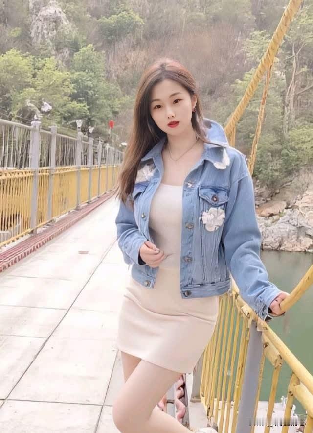元气美女在秋千桥上,牛仔外套与白裙的完美搭配,轻松自在,享受美好时光!🌿