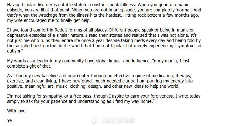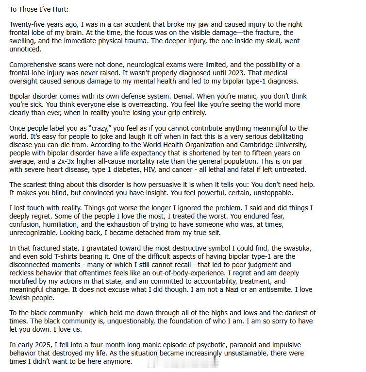 坎爷本周在华尔街日报登报道歉,他“不是纳粹”,并向黑人群体表示“非常抱歉”。因为他刚签下合约准备发新唱片。“我对自己在那种状态下的行为感到后悔,并深感羞愧,我致力于承担责任、接受治疗并实现有意义的改变。不过,这并不能为我所做的事开脱……我不是纳粹,也不是反犹主义者。我爱犹太人……致黑人社区——在我的高潮、低谷以及最黑暗的时刻,你们一直支撑着我。黑人社区毫无疑问是我身份的基础。我非常抱歉让你们失望了。我爱我们。在2025年初,我陷入了一场长达四个月的躁狂发作,伴随精神病性、偏执和冲动行为,这摧毁了我的生活。随着情况变得越来越不可持续,有时候我甚至不想再活下去。患有双相情感障碍是一种持续的精神疾病状态。当你进入躁狂发作时,你在那时是病态的。当你不在发作期时,你完全是‘正常’的。而这时,疾病造成的残骸打击最为沉重。几个月前触底反弹时,我的妻子鼓励我终于去寻求帮助。我竟然在Reddit论坛上找到了慰藉。不同的人讲述着类似性质的躁狂或抑郁发作经历。我读他们的故事,意识到自己并不孤单。并不是只有我一个人,尽管每天服药、被世界上所谓最好的医生告知我不是双相情感障碍,而只是表现出‘自闭症症状’,却每年毁掉自己整个人生。作为社区领袖,我的话语具有全球影响力和冲击力。在躁狂状态下,我完全失去了对这一点的认识。如今,通过有效的药物、治疗、运动和健康生活方式,我正在找到新的基准和新的中心,获得了急需的清晰头脑。我正将精力投入到积极、有意义的艺术中:音乐、服装、设计以及其他有助于世界的新想法。我不是在寻求同情,也不是想得到免责通行证,尽管我希望能赢得你们的原谅。今天写下这些,只是想请求你们的耐心和理解,让我找到回家的路。”带着爱,