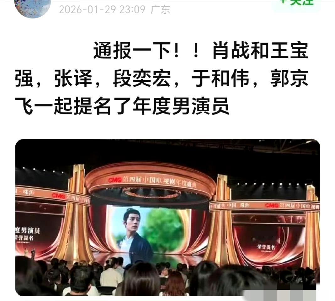 总台视帝提名神仙打架!肖战《藏海传》片段播出时,现场欢呼声直接炸了 第四届中国电视剧年度盛典的视帝提名名单一公布,直接让网友们坐不住了! 于和伟、郭京飞、王宝强、张译、段奕宏、肖战六位实力派演员同台竞争,堪称“神仙打架”级别的阵容。这不仅是收视与口碑的碰撞,更是老戏骨与中生代演员的实力交锋,含金量拉满。 最让人激动的是盛典现场,当《藏海传》的片花播出时,台下瞬间爆发出全场最热烈的欢呼声。作为肖战挑战的全新角色,他塑造的藏海兼具隐忍与锋芒,细腻的演技和极具代入感的情绪张力,让观众在片段播出时就陷入剧情,也印证了这部剧“有口皆碑”的好口碑。 从《陈情令》到《藏海传》,肖战用一部部作品证明了自己的成长与蜕变。这次提名不仅仅是对他演技的认可,更让观众对《藏海传》的正式播出充满期待。