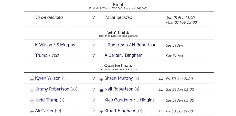 德国大师赛八强对阵! 今晚明晨,斯诺克德国大师赛将进行1/4决赛,9局5胜赛制,赛程如下: 30日21点: 斯图尔特·宾汉姆vs阿里·卡特 凯伦·威尔逊vs肖恩·墨菲 31日3点: 尼尔·罗伯逊vs吉米·罗伯逊 肖国栋vs贾德·特鲁姆普