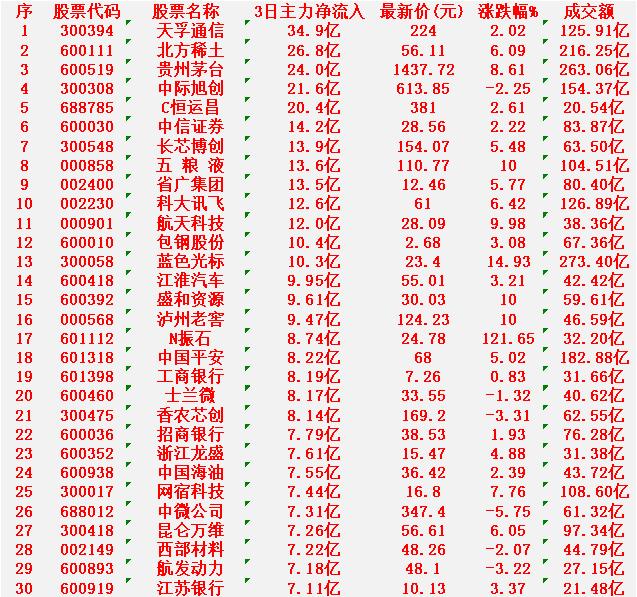 1月30日,前3天主力大幅买入的30名单! 天孚通信:净流入 34.9亿元,成交额 125.91亿元 北方稀土:净流入 26.8亿元,成交额 216.25亿元 贵州茅台:净流入 24.0亿元,成交额 263.06亿元 中际旭创:净流入 21.6亿元,成交额 154.37亿元 C恒运昌:净流入 20.4亿元,成交额 20.54亿元 中信证券:净流入 14.2亿元,成交额 83.87亿元 长芯博创:净流入 13.9亿元,成交额 63.50亿元 五粮液:净流入 13.6亿元,成交额 104.51亿元 省广集团:净流入 13.5亿元,成交额 80.40亿元 科大讯飞:净流入 12.6亿元,成交额 126.89亿元