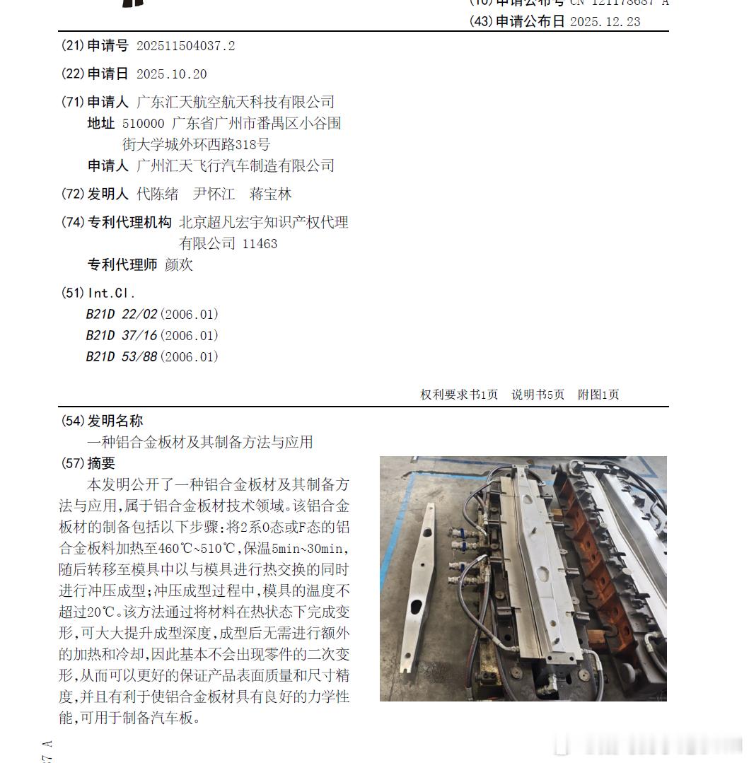 技术巡猎 小鹏汇天 “一种铝合金板材及其制备方法与应用”---想起来看看航天和汽车的差异,于是看到了这个,这个专利主要说的是2系铝合金比较折磨的流程---“成型完再固溶淬火”。就借此感受下,古人打铁,为什么有些是铸剑名师,有些只能做做菜刀的差异吧?2系零件如果直接固溶淬火,固溶温度水淬到室温的快速温变,会让表面急剧变形,后面得做大量的人工整形,整形完也很难回到热处理前的状态。可你又不能一直用O态---强度和疲劳不够;你想用T4去冲复杂形面呢,又很难冲出来。所以现实里比较常见的做法是:O态或F态先冷冲压成型,再去固溶淬火,去实现零件T42的强度要求。可是问题也在这里:成型后如果再经历一次“加热+冷却”,二次变形几乎是必然的,尺寸和表面质量就很难稳定。汇天的解法是把“固溶+淬火”跟“冲压”合并到同一个动作里完成。工艺窗口这里几乎就是个节拍表了:2系O态或F态板料加热到460℃---510℃,保温5---30min;保温结束后从出炉到合模开始,转移时间控制在30s以内;然后进模具冲压成型,同时跟模具热交换完成降温,且冲压过程中模具温度不超过20℃。为什么加热温度卡在460℃---510℃?温度低了,第二相化合物溶不干净,尤其是难溶的那部分;温度高了容易过烧产生缺陷。它举了一个典型例子:过烧温度505℃、化合物回溶开始温度460℃,在炉温均匀性常见±5℃的现实下,更推荐把板料加热控制在465℃---500℃。30s以内转移---2系对“过冷敏感性”很高,所以严格控制从出炉到合模开始这段时间;并且板料越薄,降温越快,就越要把转移时间再压短。实施例里给了0.6mm的2024板料,500℃保温20min,15s内转移进模;模具10℃,水冷5℃,流速5m/s,冷媒通道离冲压端口5mm---这套组合的目的,就是让材料在极短时间内把温度降下去。而“换热能力”,它给的条件基本就是要把模具当成一台小型冷却机:模具里设冷媒通道;冷媒温度不超过10℃(示例里甚至到2℃、5℃);流速不低于2m/s;冷媒通道到冲压端口距离不超过10mm。逻辑也很直白:模温高于20℃,极短时间内降不下去,淬火效果不好;水温高于10℃也是同理;流速低、通道离得远,换热不够,温度降不下来,淬火就虚了。价值点其实很简单的,热态高塑性,和模内强冷却,实现了一个不错的成型结果,此后不需要再额外加热和冷却了,所以“基本不会出现零件的二次变形”,从而保证表面质量和尺寸精度;同时也能让板材拿到更好的力学性能和抗疲劳性能。站在飞行汽车这条线上,这套东西最直接的意义,依然是“量产一致性”。