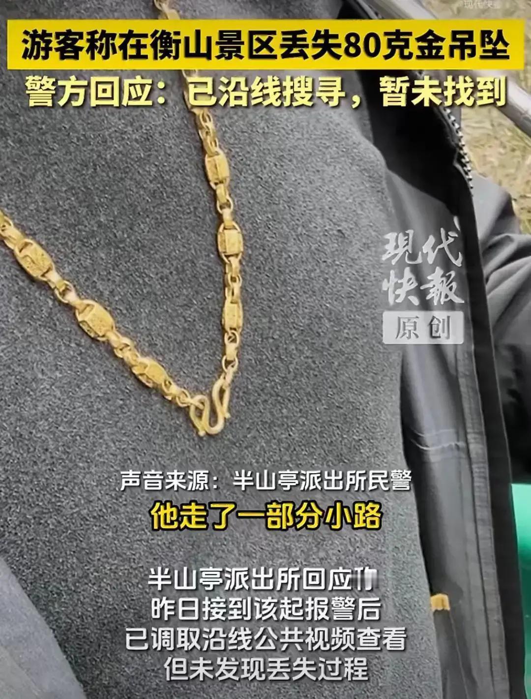 佩戴如此贵重和易丢的首饰爬山,如果真丢了也是这位广西游客个人的责任,与衡山景区无关。山上树枝到处都是,穿戴如此贵重的物品爬山,稍不注意就会丢失,而且茫茫大山丢了也根本找不到。俗话说财不外露,这位游客不仅外露还不注意保管,估计也是不缺钱的人,如果真丢了就当买个教训吧。另外,到底是不是真丢也很难说,虽然照片上的金牌没有了,但也有可能自己摘下来的。一切都很难说。