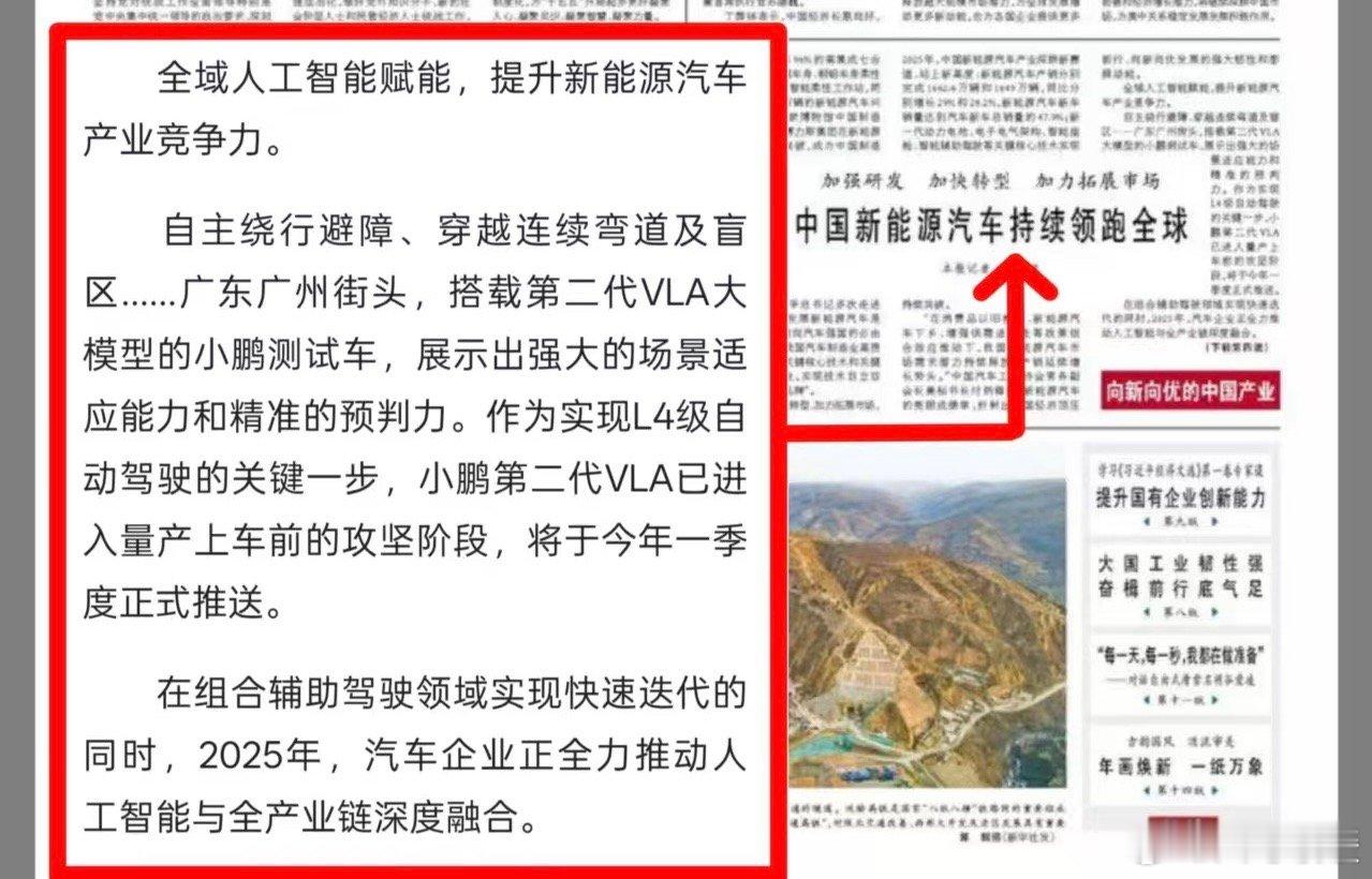 人民日报头版聚焦了中国新能源汽车,小鹏第二代VLA大模型被重点提及,实测表现超亮眼,自主绕行避障、穿连续弯道和盲区,这些都是日常开车最刚需的场景,还确定今年一季度量产推送,这可是冲着L4级自动驾驶去的,智驾终于要贴近真实用车了。我作为经常开车的人,真的太懂复杂路况下的驾驶焦虑了,能自动避障、预判路况的智驾,真的能大幅提升开车的安全感和轻松度。智驾的核心从来不是炫技,而是让普通人开车更省心、更安全,小鹏VLA的量产推进,让大家看到了智驾技术从实验室走到日常道路的希望,也期待后续更多车企跟上,让智能驾驶真正普惠用户。中国新能源汽车持续领跑全球