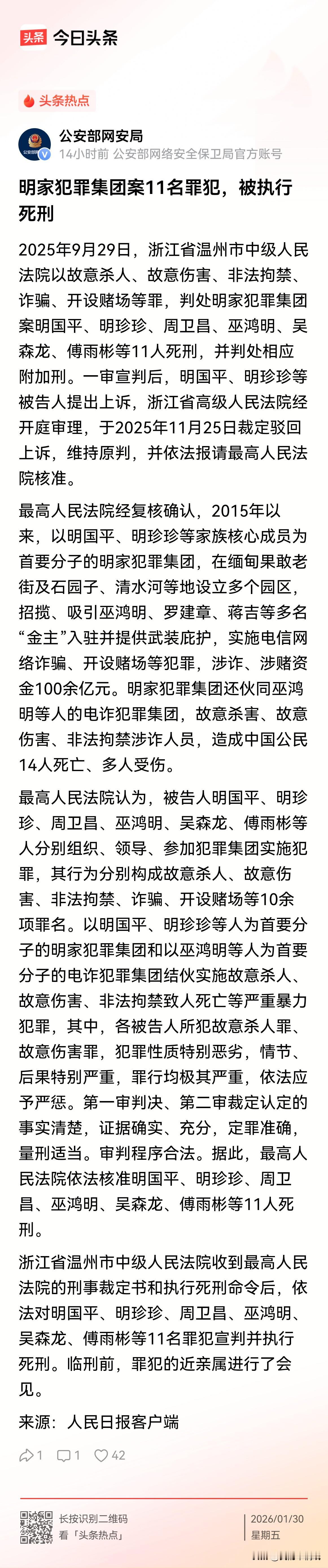 一案判11人死刑,这在近几年确实极为罕见!说明这些人为非作歹,罪大恶极,终于因为恶贯满盈而被绳之以法,这是他们罪有应得的结局。 据媒体报道,2026年1月29日,经最高人民法院核准,盘踞缅北、残害我国公民的明家犯罪集团11名主犯被依法执行死刑。该集团涉诈涉赌资金超百亿,更直接造成14名中国公民死亡。 从跨国追缉到庄严审判,此举以雷霆之势宣告:侵害我同胞者,无论躲在何处,都必将受到中国法律的严厉惩处。 这正是“犯我中华者,虽远必诛”在法治时代的强大回响。正义终至,国威凛然!