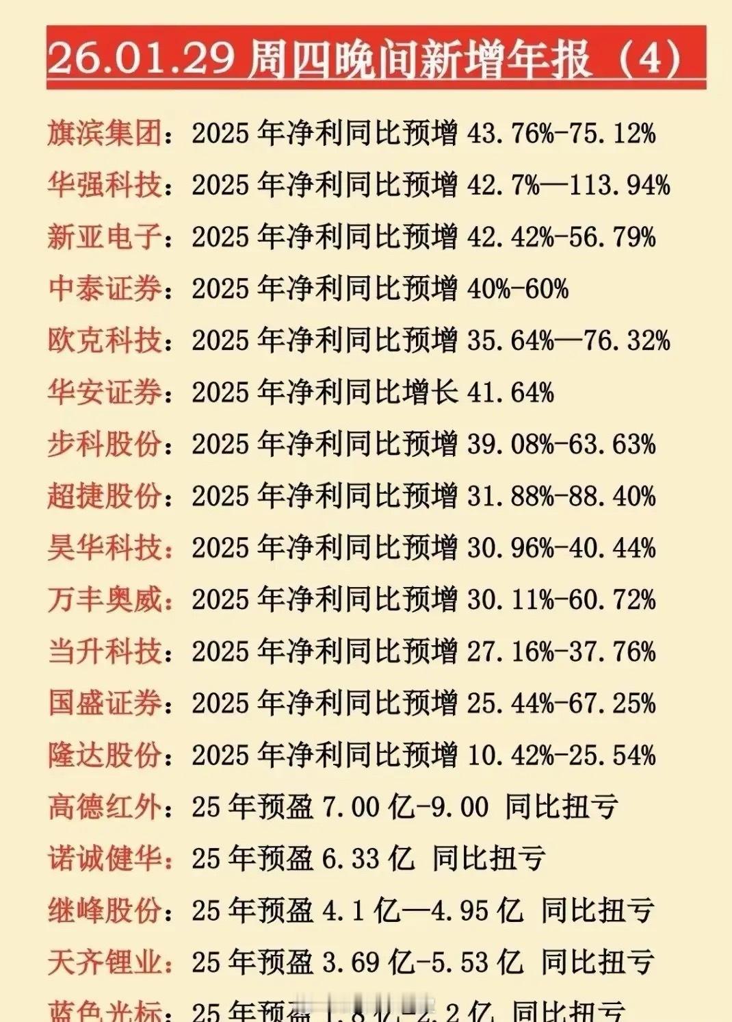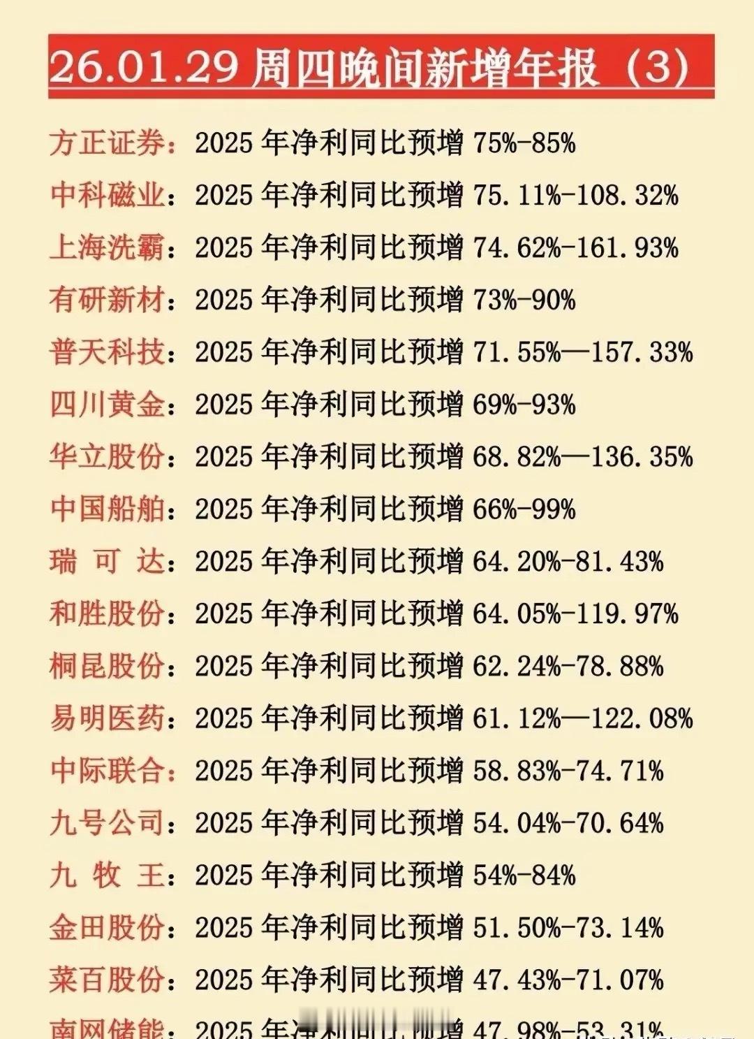 1月29晚间披露年报预增标的梳理(下)这些标的净利润增幅覆盖10%-161%区间,还包含多只扭亏为盈个股,覆盖券商、新材料、黄金、船舶、电子、医药、新能源等板块。既体现周期复苏、政策驱动的行业性盈利改善,也包含公司业务优化、困境反转的个体增长,反映A股多维度的盈利修复格局。个股梳理1. 方正证券:2025年净利润预增75%-85%,作为券商,受益于市场交投活跃,经纪、投行等业务回暖,带动盈利提升。2. 中科磁业:预增75.11%-108.32%,主营钕铁硼磁材,新能源与机器人需求增长,产能释放推动业绩。3. 上海洗霸:预增74.62%-161.93%,主营水处理服务,环保政策驱动需求,订单放量带动盈利增长。4. 有研新材:预增73%-90%,主营半导体新材料,国产替代加速,下游需求增长推动业绩。5. 普天科技:预增71.55%-157.33%,主营通信网络服务,算力基建需求增长,业务拓展带动盈利。6. 四川黄金:预增69%-93%,主营黄金采选,金价上行周期,资源优势释放,盈利改善。7. 华立股份:预增68.82%-136.35%,主营装饰板材,消费复苏与地产回暖,订单增长推动业绩。8. 中国船舶:预增66%-99%,主营船舶制造,航运周期复苏,新船订单放量,产能利用率提升。9. 瑞可达:预增64.20%-81.43%,主营连接器,新能源汽车与储能需求增长,产品放量带动盈利。10. 和胜股份:预增64.05%-119.97%,主营铝制结构件,新能源汽车需求增长,产能扩张推动业绩。11. 桐昆股份:预增62.24%-78.88%,主营涤纶长丝,纺织需求复苏,产品量价齐升带动盈利。12. 易明医药:预增61.12%-122.08%,主营中成药,核心产品放量,渠道优化推动业绩增长。13. 中际联合:预增58.83%-74.71%,主营风电设备,风电装机增长,海外业务拓展带动盈利。14. 九号公司:预增54.04%-70.64%,主营智能短交通设备,消费复苏与出海增长,订单放量。15. 九牧王:预增54%-84%,主营男装,消费复苏与品牌升级,渠道优化提升盈利水平。16. 金田股份:预增51.50%-73.14%,主营铜加工,铜价上行与新能源需求增长,产能释放推动。17. 菜百股份:预增47.43%-71.07%,主营黄金珠宝,金价上行与消费复苏,门店扩张带动盈利。18. 南网储能:预增47.98%-53.31%,主营储能业务,政策驱动需求增长,装机规模提升盈利。19. 旗滨集团:预增43.76%-75.12%,主营玻璃制造,地产复苏与光伏玻璃需求增长,产品量价齐升。20. 华强科技:预增42.7%-113.94%,主营军工防护装备,军工订单放量,国产替代推动业绩增长。21.新亚电子:预增42.42%-56.79%,主营电子线材,消费电子复苏与新能源需求,订单增长。22. 中泰证券:预增40%-60%,作为券商,市场交投活跃,自营与经纪业务回暖,盈利改善。23. 欧克科技:预增35.64%-76.32%,主营纸浆设备,造纸行业复苏,设备需求增长带动盈利。24. 华安证券:预增41.64%,作为券商,受益于市场行情回暖,业务收入增长,盈利提升。25. 步科股份:预增39.08%-63.63%,主营伺服系统,机器人需求爆发,产品放量推动业绩。26. 超捷股份:预增31.88%-88.40%,主营精密紧固件,新能源汽车需求增长,产能扩张带动。27. 昊华科技:预增30.96%-40.44%,主营氟化工材料,新能源与高端制造需求增长,产品升级。28. 万丰奥威:预增30.11%-60.72%,主营铝轮毂,新能源汽车需求增长,海外业务拓展推动。29. 当升科技:预增27.16%-37.76%,主营锂电正极材料,新能源汽车需求增长,产能释放。30. 国盛证券:预增25.44%-67.25%,作为券商,市场交投活跃,业务收入增长,盈利改善。31. 隆达股份:预增10.42%-25.54%,主营高温合金,航空航天需求增长,技术优势带动业绩。32. 高德红外:预盈7-9亿,同比扭亏,主营红外探测器,军工与民用需求增长,订单放量。33. 诺诚健华:预盈6.33亿,同比扭亏,主营创新药,核心产品获批上市,收入增长推动。34. 继峰股份:预盈4.1-4.95亿,同比扭亏,主营汽车座椅,新能源汽车订单增长,产能利用率提升。总结这批标的涵盖多行业,既有券商、周期品的行业复苏,也有科技、军工的成长驱动,还有困境反转的扭亏个股,反映A股市场多维度的盈利改善。后续需重点关注业绩兑现能力与增长持续性,高弹性标的或成市场焦点。本文涉及资讯数据内容来自网络,仅供参考,不构成投资建议!