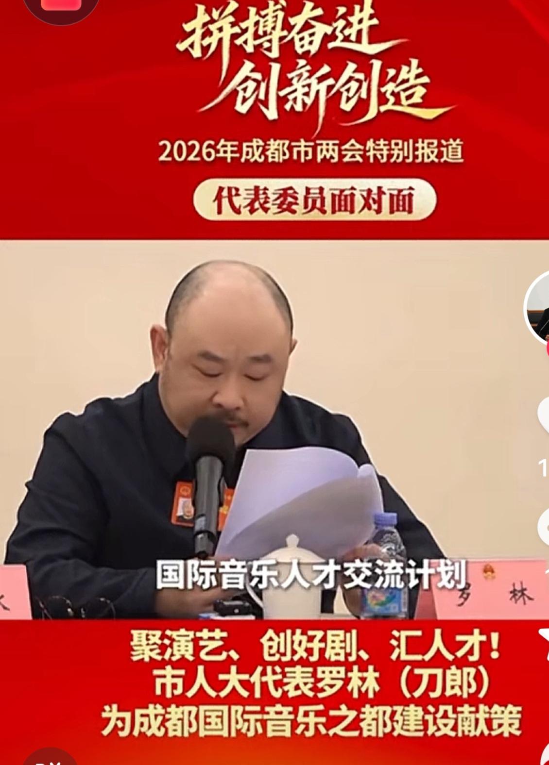 刀郎(罗林)巡演后曝光了。给力给力! 在成都2026两会上提出建议议案,很有分量。 他除了提出在网红打卡老城区改造时要规划布局音乐加非遗,音乐加工坊,音乐加传承,音乐要体现出天府特色的原创剧的建议外,最重要的一项,我认为它有宏大视野,艺术高度,政治头脑的是:他提出要有国际音乐交流人才计划,邀请国外的音乐家到天府之国进行采风,驻留,交流,用他们的音乐语汇表达中国文化,彰显中国文化自信。 无疑这是一个国际视野、文化交流的高度。 刀郎味道的建议议案果不其然就是这样的有专业角度和认知高度,希望各地两会也能涌现出一批这样的艺术工作者,提出可行的具有特色的建议议案,为文化中国建设出力添彩。