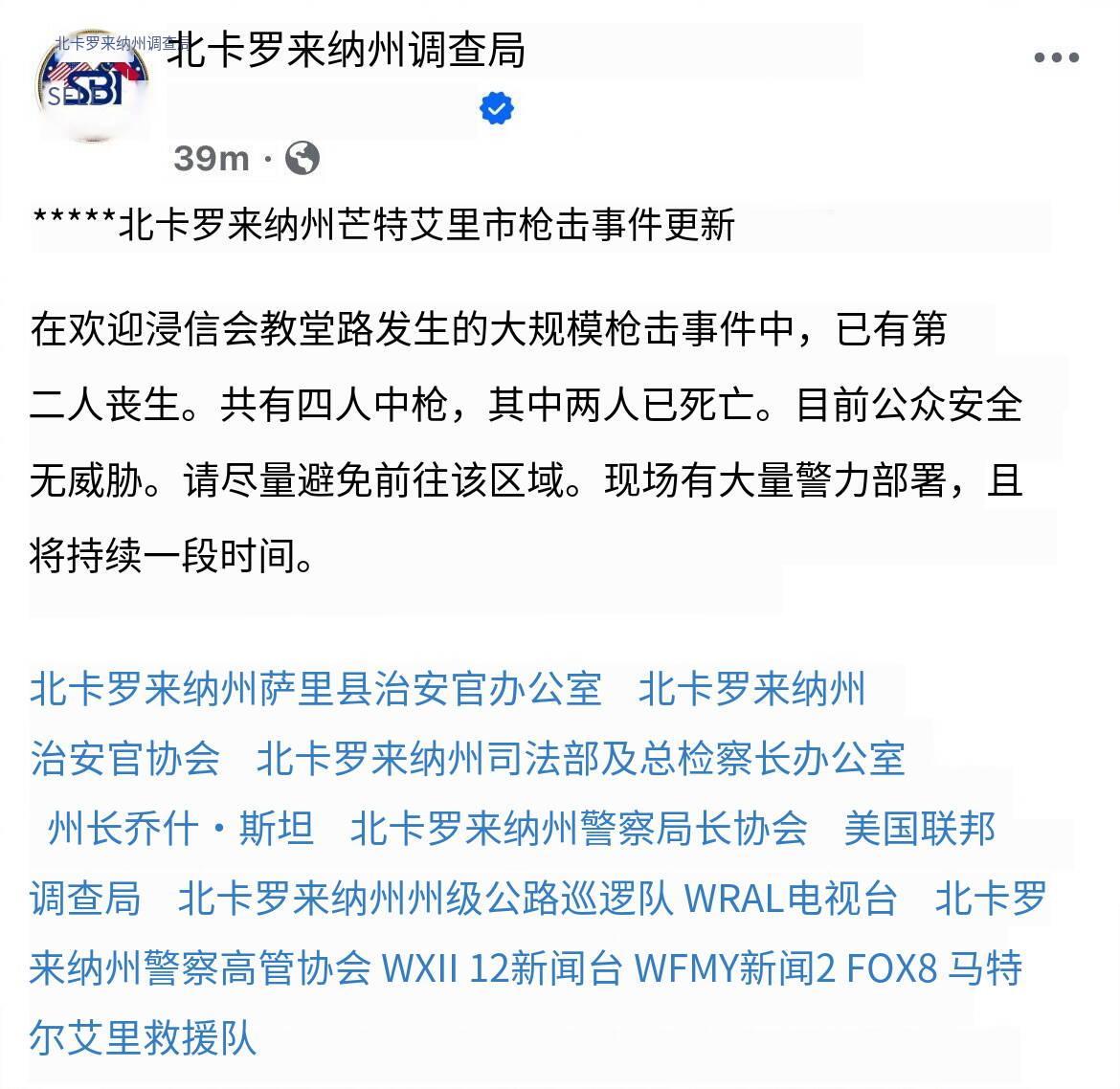 新闻快讯——美国北卡罗来纳州发生枪击事件 致2死2伤 2026年1月30日,美国北卡罗来纳州芒特艾里(Mount Airy)的Welcome Baptist Church Road附近发生大规模枪击事件。 北卡罗来纳州调查局(NCSBI)最新通报显示,事件共造成4人中弹,其中2人死亡,另有2人受伤。目前警方已确认现场无持续公共安全威胁,但仍在该区域部署大量警力,并呼吁民众尽量避开事发地点。 当地多个执法与救援部门已介入调查,包括苏里县警长办公室、联邦调查局(FBI)及北卡罗来纳州公路巡警等,后续调查进展将及时公布。