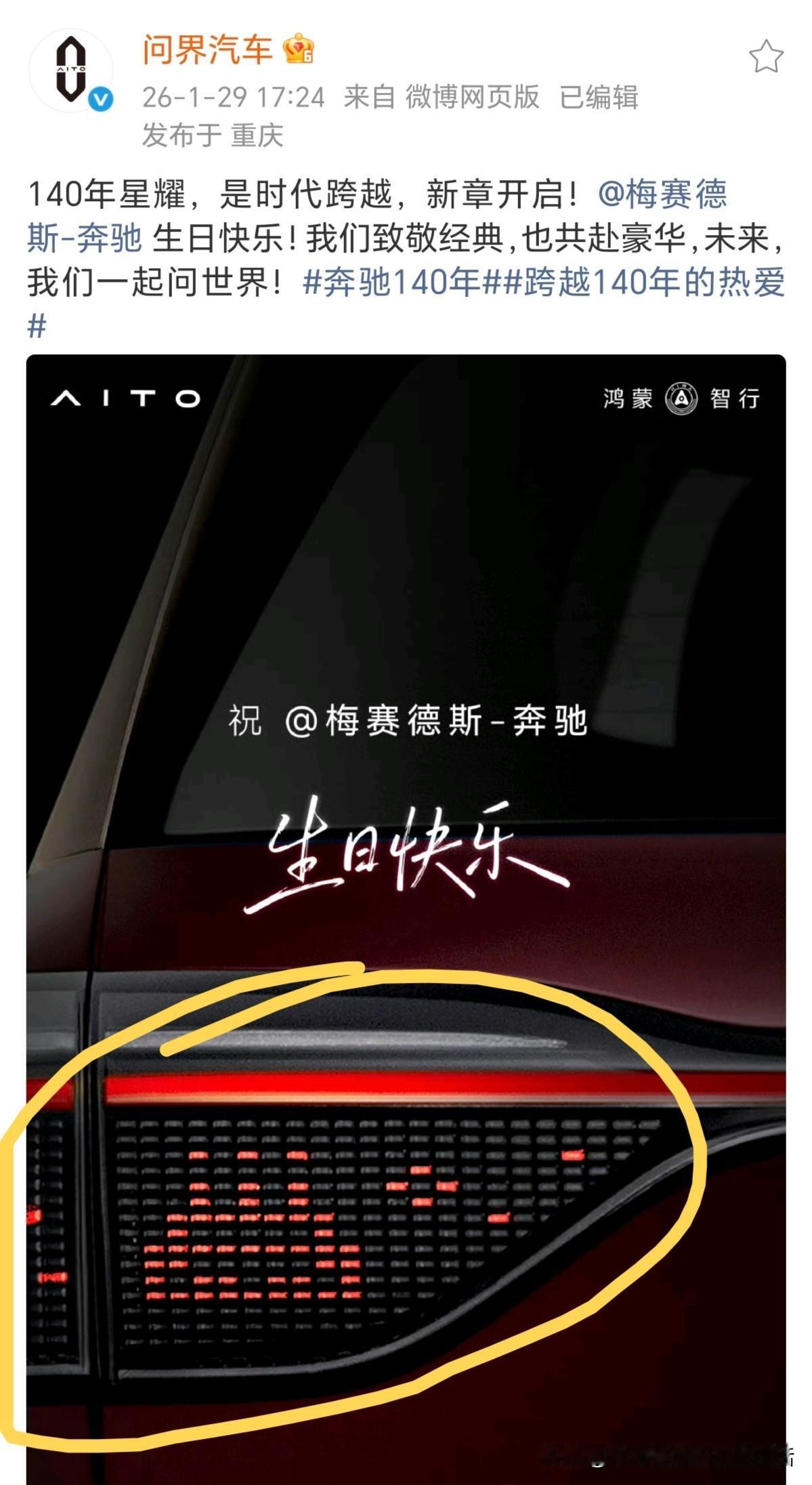 太甜了!这是一场跨越140年的热爱! 奔驰140周年! 问界深情致敬:140年星耀,是时代跨越,新章开启!祝梅赛德斯-奔驰 生日快乐,致敬经典,也共赴豪华,未来一起问世界! 奔驰暖心回应:“问”向未来,就会有答案🤩! 大家注意看!问界的排面来了,直接给你显示生日蛋糕🎂尾灯!而且是红色的问界M9!问界用心了! 余承东格局拉满!百年星辉的经典豪华,遇上智能新生的科技豪华,没有隔阂,只有惺惺相惜。 值得一提的是,赛力斯也致敬了奔驰:祝梅赛德斯-奔驰 140周年快乐!🎂向汽车发明者致敬,期待与所有同行者,共赴新程。 奔驰回应赛力斯:一起向前奔驰~ 强者的惺惺相惜,这才是大厂风范!格局决定高度,给问界点赞,也祝奔驰越办越好!