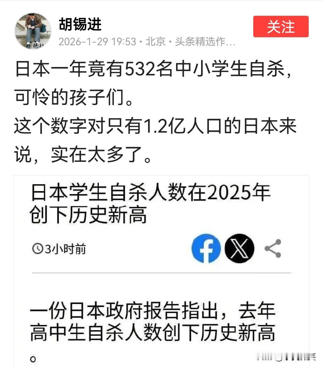 老胡说,日本的中小学生们太可怜了。 你们怎么看?