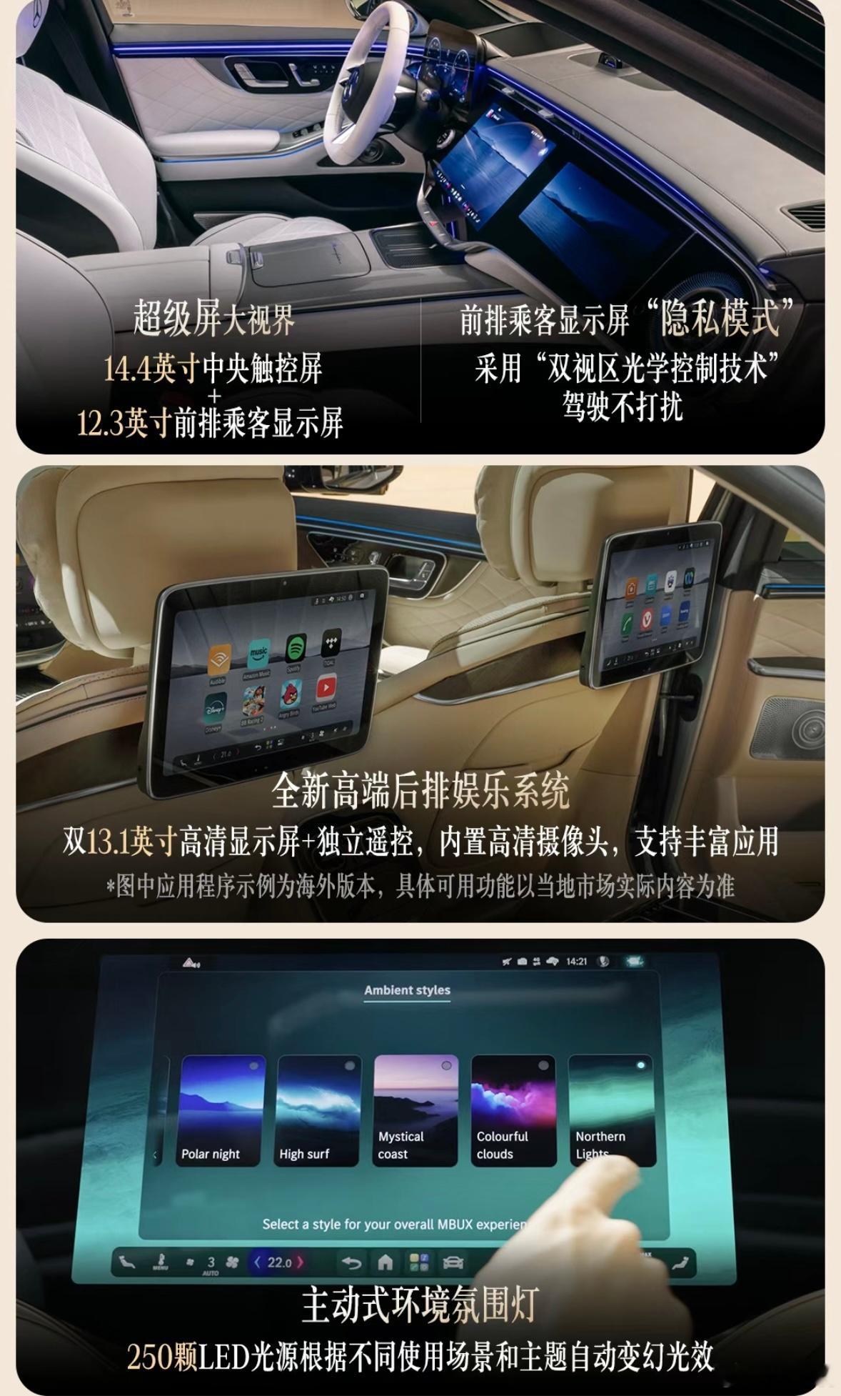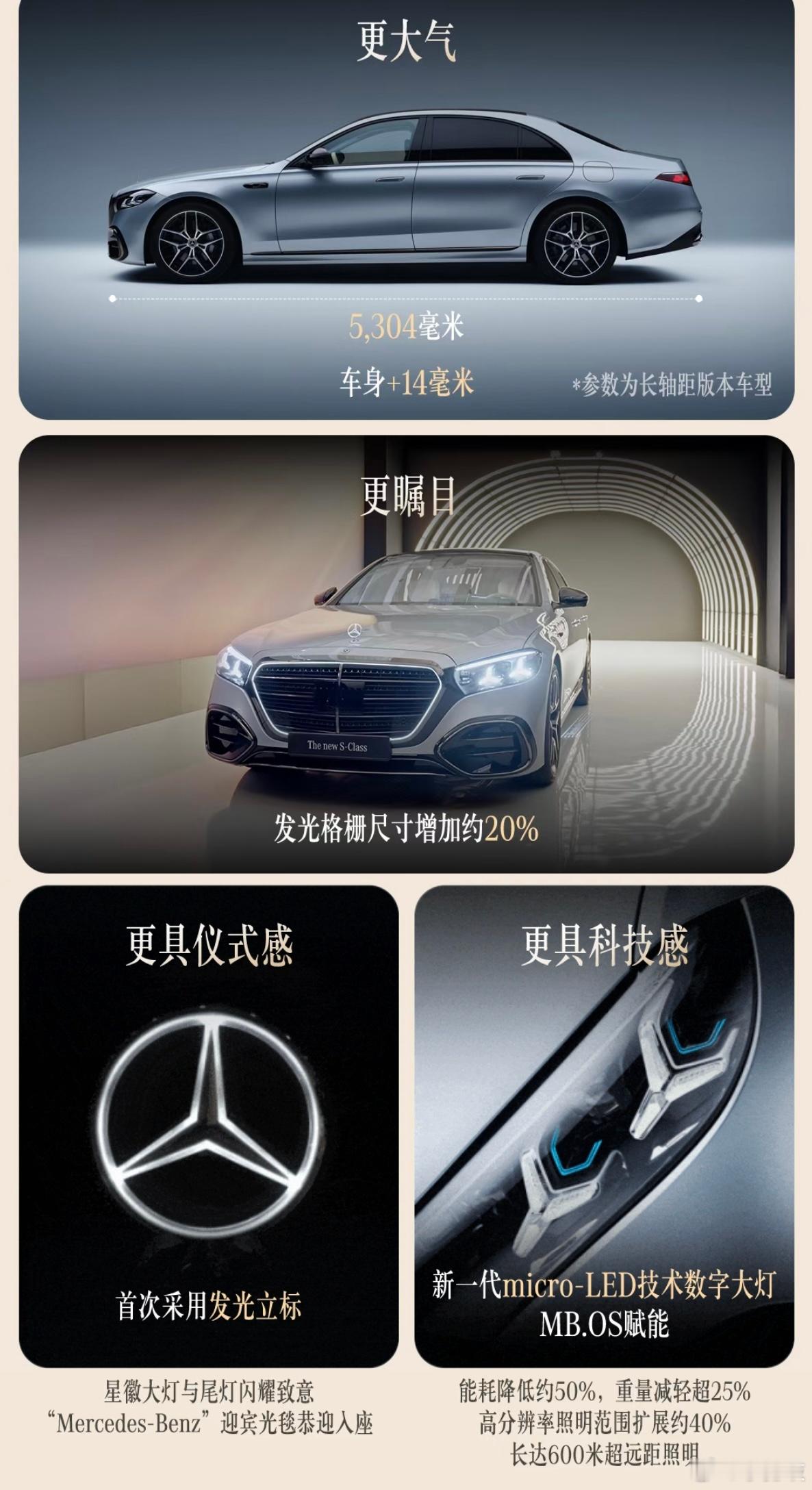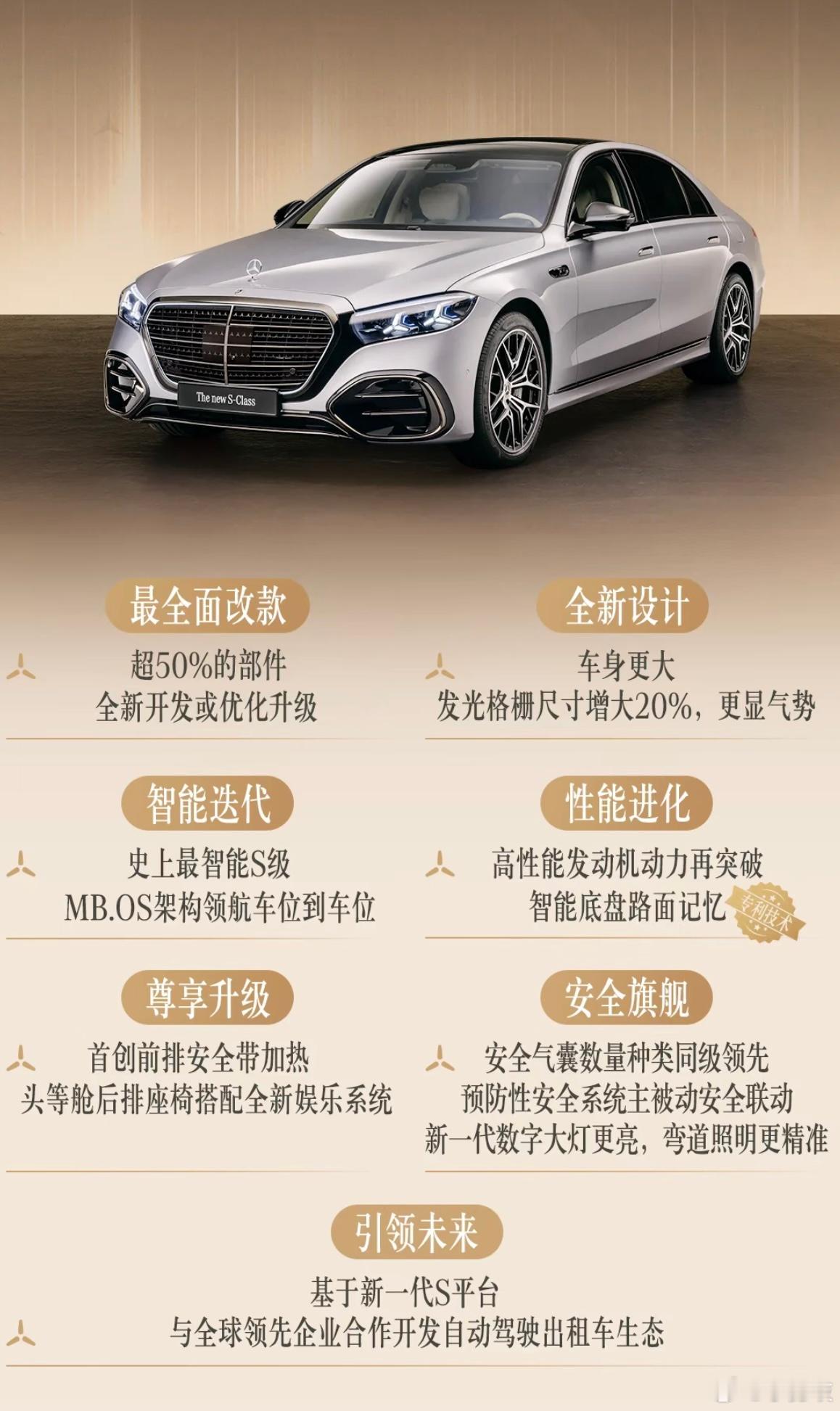 超50%的新部件,搭载最新科技,车标能发光!新款梅赛德斯-奔驰S级来了1886年1月29日,卡尔·本茨正式递交奔驰一号专利申请,于是今天(德国当地时间1月29日)我们不仅迎来梅赛德斯-奔驰的140周岁,同时也是汽车工业诞生140周年纪念日。在这一历史性时刻,新款奔驰S级正式首发亮相。值得一提的是,虽然这是中期改款版本,但是用全新换代来形容它也一点都不过分,根据官方透露,新车有超过50%的零部件为全新开发或重新设计,同时它也应用了奔驰最新科技。在新款奔驰S级的前脸,我们看到了全新样式的发光格栅,它的尺寸较现款S级增加了约20%,因此内部采用四条横向镀铬辐条,并加入3D镀铬星徽进行点缀。格栅上方依旧是熟悉的三叉星徽立标,它首次配备自发光功能,即使在夜晚也拥有非常高的辨识度。14.4英寸中央触控屏内置最新的MBUX智能人机交互系统,整合了ChatGPT4o、微软必应以及谷歌Gemini等生成式AI技术,使奔驰虚拟助手能够实现复杂的多轮对话,且具有短期记忆功能。驾驶辅助方面,新款奔驰S级提供10个外部摄像头、5个雷达传感器、12个超声波传感器。标配MB.DRIVE辅助驾驶,可支持带车道居中功能和变道辅助功能的自适应巡航。升级MB.DRIVE辅助驾驶PLUS可解锁智能泊车辅助系统,其首次支持斜向停车,支持时速5公里/小时下的泊车辅助,还支持循迹倒车功能,未来还可OTA升级轮圈保护预警功能。值得一提的是,未来新款S级在中国市场还会提供城区及高速领航辅助驾驶系统。动力方面,提供汽油、柴油和插电混动版本,目前国内奔驰S级动力均搭载2.5T直列六缸发动机,并未提供V8版本,推测新款奔驰S级引入国内之后,大概率只会带来六缸发动机与48V电机组成的轻混系统以及与电机组成的插电混动系统,而全新的V8发动机预计会搭载在迈巴赫以及AMG版本中进入国内市场。不用多想,新款奔驰S级竞争对手依然会锁定宝马7系和奥迪A8L,宝马7系(计划2026年下半年发布中期改款车型)在2022年完成换代之后,水晶内饰确实令人眼前一亮,不过它的外观设计也引起了不少的讨论;而奥迪A8L(暂无准确换代信息,或要等到2029年)则是在2017年完成换代,2022年进行中期改款。从产品力上来说,两个竞品车型都进入到了疲软期,新款S级堪比换代的进化自然也会加大它的优势。奔驰S级
