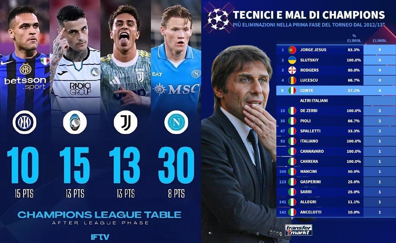 至今我都想不通孔蒂是怎么做到把意甲冠军带到欧冠30名的?难道他只能带联赛? 你说一次两次还情有可原,结果带了好几个队,没有一次欧冠有好成绩的,这就真是菜了。 其实如果你看过孔蒂历年的欧战成绩那就不觉得奇怪了, 可以把有巅峰BBC+MVP的尤文带到小组出局,也是个神人。换囧就3年2决赛。 当年13-14赛季把意甲冠军尤文带进了联盟杯,20-21赛季把小国际带的连联盟杯都没得踢。 孔蒂欧冠绝大多数时候连小组出线都办不到(13-14,19-20,20-21,25-26)16强2次(17-18,22-23),8强一次(12-13)。