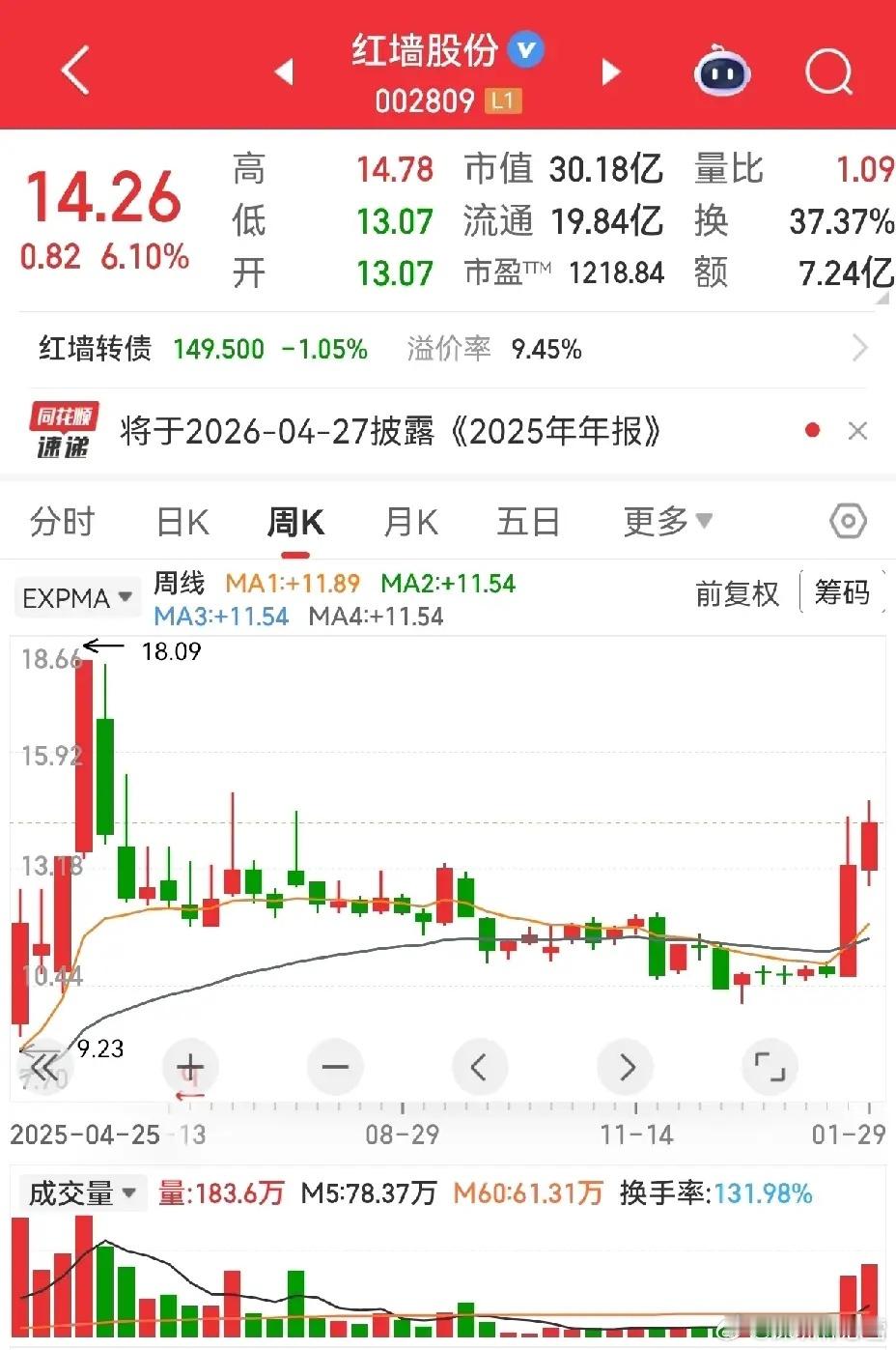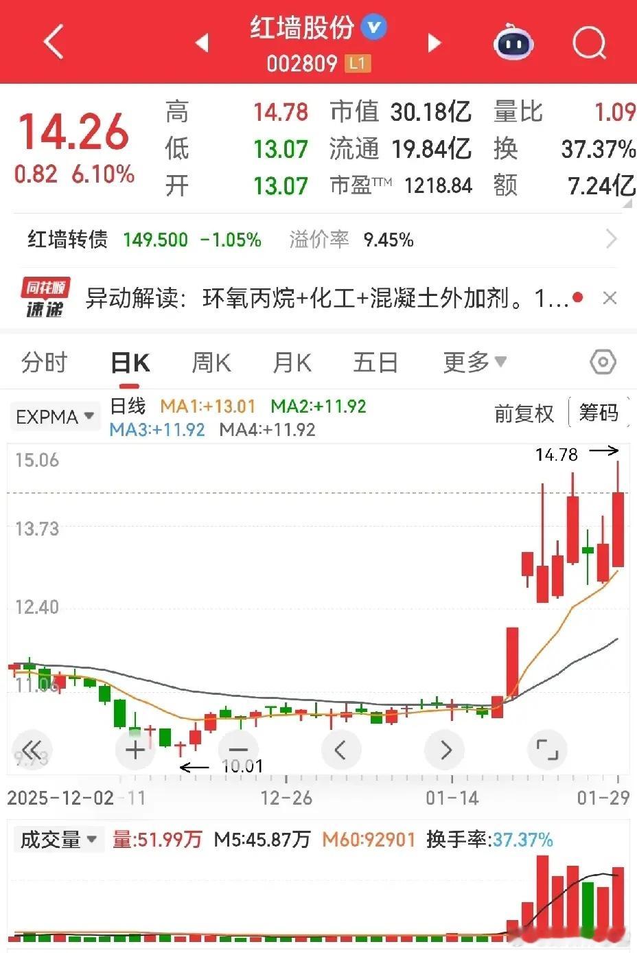 红墙股份走得有点意思,九阳夹一阴形态下始终抗跌,反观业绩却是2025年由盈转亏,股价和基本面的背离属实让人琢磨!这波走势大概率还是沾了环氧丙烷涨价的光,又是熟悉的“涨价”关键词加持 但其实公司32万吨环氧乙烷/环氧丙烷衍生物项目年中才投产,25年业绩贡献有限,新项目折旧还拉低了利润,涨价红利自然没法体现在25年业绩里,这点也在情理之中。短期走势看情绪,长期还是得看产品价格和新产能的化学反应,后续值得持续观察。