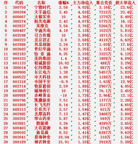 1月30日开盘45分钟,主力资金“买入的 ”的30名单一览! 宁德时代:净流入 9.02亿元 天孚通信:净流入 4.62亿元 太极实业:净流入 4.36亿元 阳光电源:净流入 4.07亿元 英维克:净流入 3.76亿元