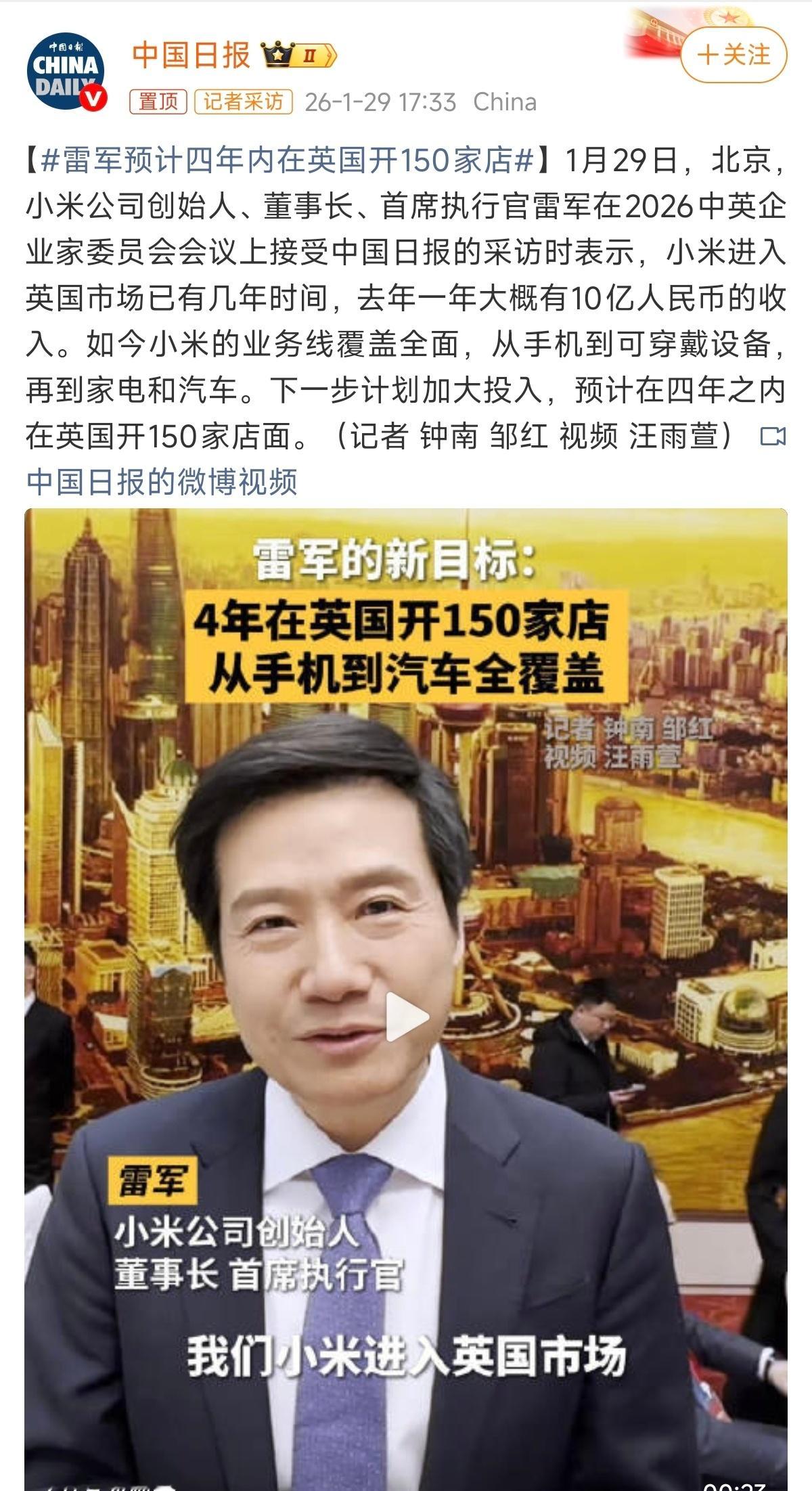 雷军参加了2026中英企业家委员会会议,在接受采访时表示,小米的业务泛微很广,涉及到手机、智能穿戴、家电、汽车等。2025年小米在英国大概有10亿人民币的收入,预计在四年之内在英国开150家店面。雷军预计四年内在英国开150家店