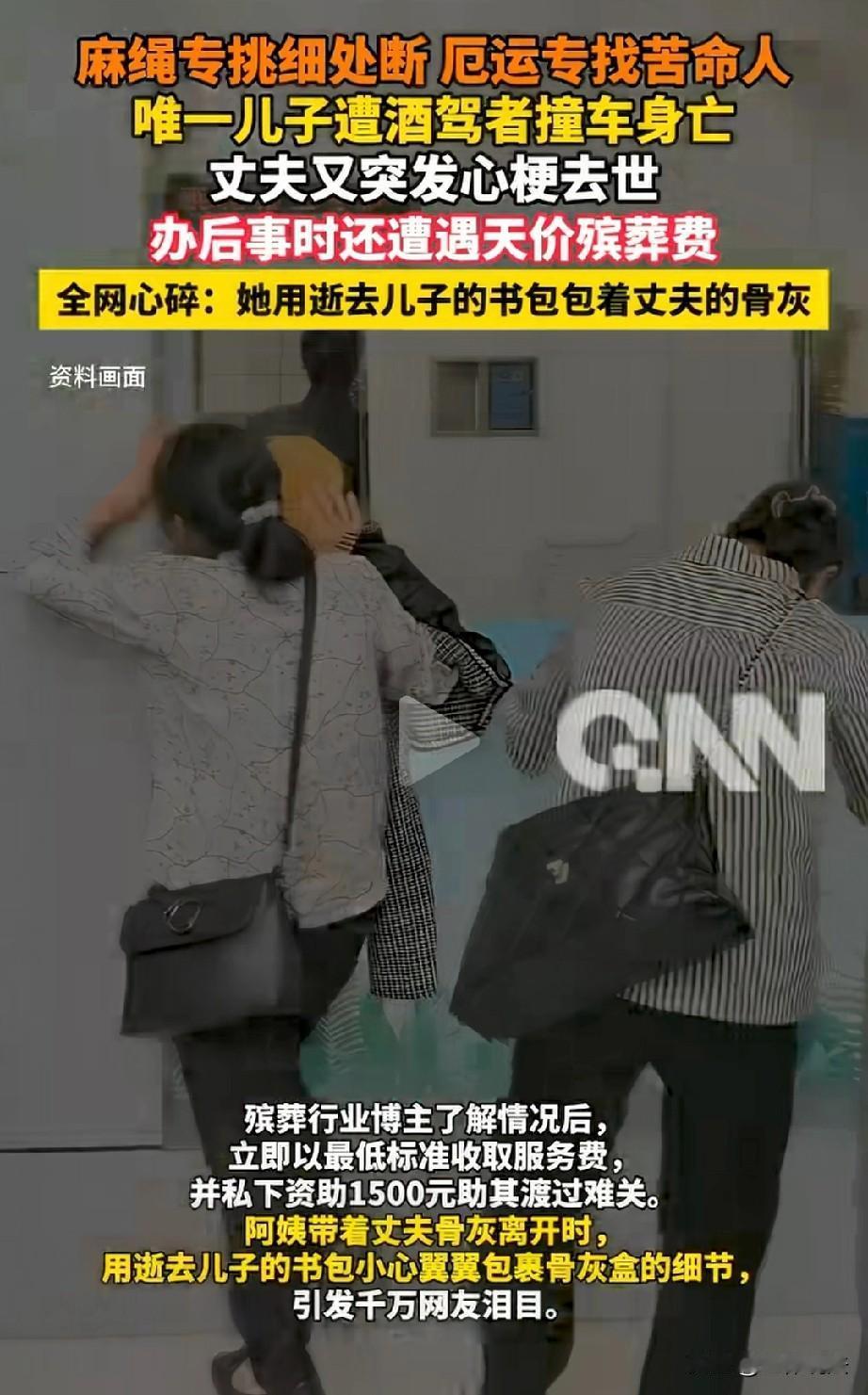 苦命人!老两口背井离乡,打工挣钱,供唯一的儿子考上大学,谁知,儿子还没毕业,竟被酒驾者撞车身亡。老两口的天瞬间塌了,丈夫又不堪打击,突发心梗去世。阿姨跪地借了2800元,强撑着为丈夫办后事,谁知竟遭天价殡葬费:抬过去8000块,火化还要3000。幸好遇到好心人帮忙, 阿姨已用逝去儿子的书包,背着丈夫的骨灰回了老家。 阿姨和丈夫青梅竹马,相伴走过了整整60年,他们还有个宝贝儿子。为了供儿子上大学,他们背井离乡出去打工。 那些年,他们吃了多少苦,受了多少累,就盼着儿子能有出息。好在儿子也争气,顺利考上了大学。阿姨和丈夫满心欢喜,觉得日子总算有了盼头。 可命运总爱捉弄人,儿子大学快毕业实习前,被酒驾者撞倒,当场身亡。 老两口的天塌了,辛辛苦苦供出来的儿子,还没来得及成家立业,结婚生子,就这么走了。 老年丧子,对两人来说无疑是最沉重的打击。从那以后,阿姨和丈夫就像丢了魂一样,没了盼头,整天靠着日结零工勉强维持着生活。 丈夫的身体也越来越差,重病缠身,可即便如此,他们心里还是有个念想,那就是等开春攒点钱,就回农村老家,好好把儿子安葬了。 然而,命运似乎并不打算放过这对可怜的老人。 一天晚上,丈夫说他梦到,自己要走了,去找孩子,儿子在橘子树下等他。万万没想到,很快,丈夫就突发心梗,也离开了。 接二连三的打击,让阿姨几乎崩溃,可她还得强撑着,跪着向好好心人借了2800块钱,要操办丈夫的后事。 可当她去联系殡葬服务的时候,却遭遇了天价的殡葬费。对方告诉她,抬过去要8000块,殡仪馆火化又要3000块。 这对她来说是笔巨款,她说明原委,苦苦哀求对方,希望能可怜可怜她这个老婆子,后期她会想办法把钱补上的。 可对方不仅没有丝毫怜悯,反而对她辱骂起来,她陷入了“逝者难安葬、生者受欺辱”的绝境。 就在阿姨绝望的时候,她遇到了一位好心的殡葬博主,这位博主了解了阿姨的情况后,十分同情她,决定帮她一把。 博主用自己的关系和资源,帮阿姨用最低的价格完成了丧葬事宜。不仅如此,还给了她1500块钱,当做盘缠。 最后,阿姨用逝去儿子的书包装着丈夫的骨灰,一步一步地背着回了老家。 老年丧子又丧夫,本就天塌地陷,跪地借钱办后事还遇天价殡葬费,简直是趁人之危,往伤口上撒盐。 这年头真是活不起也死不起,基础丧葬本是民生刚需,却被不良商家漫天要价,把逝者尊严、生者悲痛当牟利工具,毫无底线可言。 国家必须重拳出手严管殡葬乱象,严查乱收费、强制加价,给普通百姓兜底保障,让逝者能安息,生者不被欺。