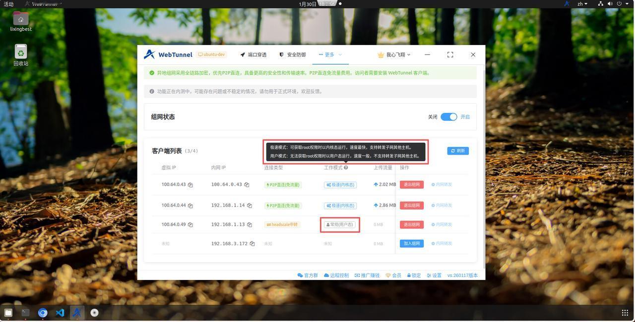 Linux 组网一定要 root 权限吗?其实有两种选择。 最近有技术群里的朋友问,公司服务器不给 root,还能搞异地组网吗? 答案是肯定的,关键看你怎么选运行模式。 安装 WebTunnel 客户端后,如果你有 root,虚拟网卡会走“极速模式”,也就是内核态,跑满带宽没压力。 要是没 root,它会自动切换到“常规模式”,走用户态协议栈。 不用改系统配置,也不用找管理员审批,直接就能把异地设备连成局域网。 这种灵活的兼容性,对于我们这种经常折腾服务器的人来说真的太友好啦!