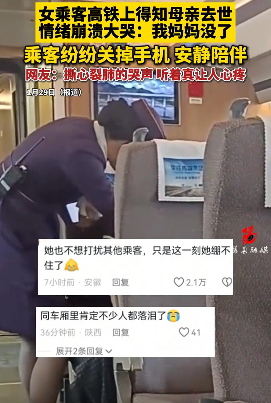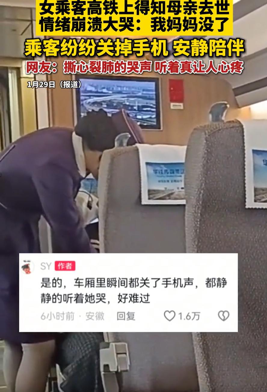 破防了!安徽,高铁车厢里,一名女乘客突然接到家里打来的电话,对方告诉她一个噩耗:妈妈走了!女子听到消息后,在车厢中突然情绪崩溃大哭起来,而同车厢的乘客也是不约而同的关掉手机,安静陪伴 视频中,当时车厢里原本有低低的交谈声,手机外放的短视频声,列车运行规律的轰鸣声。一位女乘客接了个电话,挂断后突然放声大哭,边哭边喊着,我妈妈没了。那声音里的绝望,瞬间穿透了整个车厢 周围原本在看手机的乘客,一个个默默关掉了屏幕。没有人说话,没有人抱怨,整个车厢陷入一种克制的安静里。只有她的哭声在持续,还有列车员走过来轻声安抚的声音 看到这一幕,不少网友也是感同身受 有网友说:我刚出来工作时,得知爷爷去世,我在客车上哭了一路,那时候只有悲痛只有泪水不在乎别人的眼光,觉得车开的太慢了 还有网友说:隔着屏幕,我眼泪都情不自禁,失去至亲之痛,透彻心扉,经历过的都知道有多痛 我们其实都明白,成年人的生活里,连崩溃往往都是要挑时间和地点的。能在公众场合这样不顾一切地哭出来,那一定是真的撑不住了。而周围那些陌生人的反应,没有围观,没有议论,只是安静地陪着,这种无言的体谅,恰恰是冰冷时刻最珍贵的一点暖意 生活有时候就是这样,不会提前打招呼。能做的,只有在还能抱的时候多抱一会儿,在还能说话的时候多说几句,也在别人最脆弱的时刻,给一点空间,给一点理解。哪怕只是关掉手机,安静坐着,对当事人来说,已经很重要了