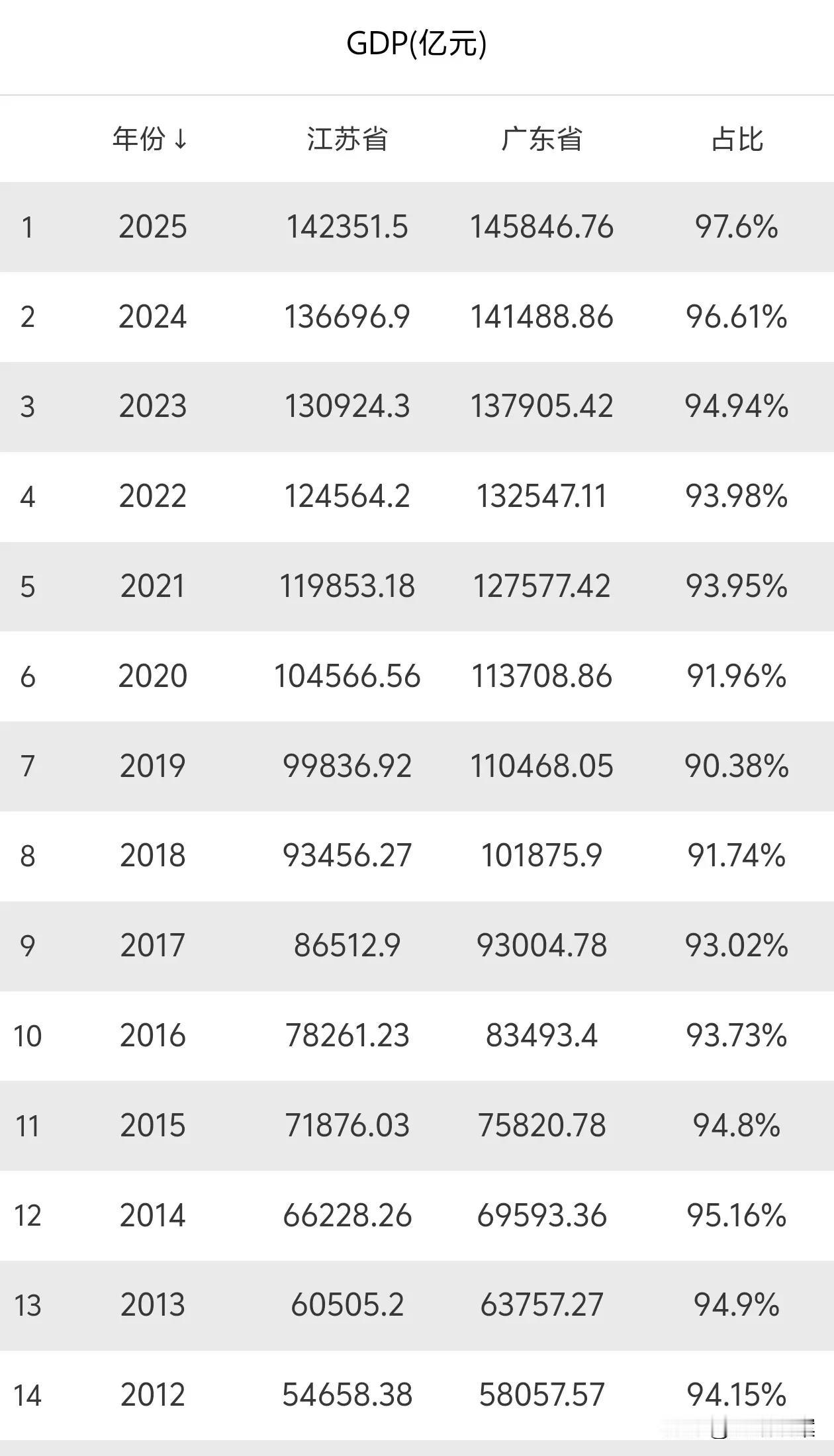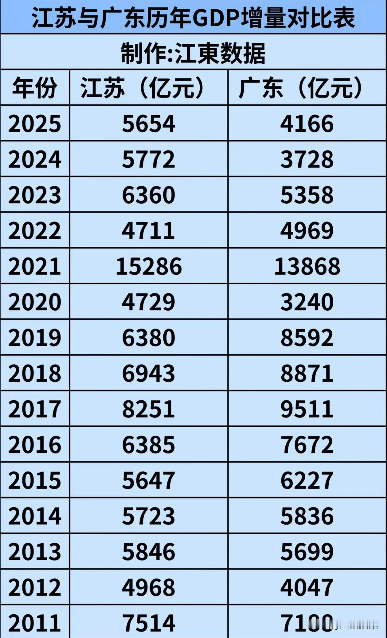 广东GDP正式公布了!增量仅4357.9亿,总量145846.76亿。江苏与广东的总量差距,只有3500亿了,关键是江苏的增量一直比广东高。 从粤苏两省历年增量对比可以看到,2019年是一个关键时刻,在此之前广东大部分时候增速快于江苏,在此之后江苏每年都比广东高。 这意味着随着时间推移,只要广东不找回状态,江苏GDP五年之内超越广东,基本没有任何悬念。广东gdp 各省GDP排行 江苏各市GDP 江苏gdp排名 江苏gdp 广州经济总量 广东经济增速