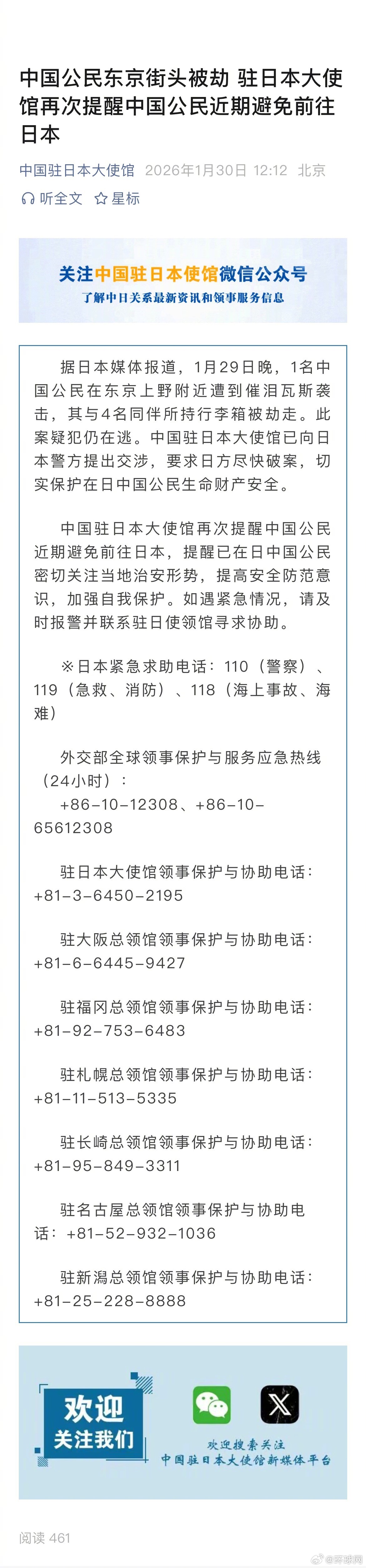 #中国公民东京街头被劫#【中国公民东京街头被劫 驻日本大使馆再次提醒中国公民近期避免前往日本】#再次提醒中国公民近期避免前往日本#