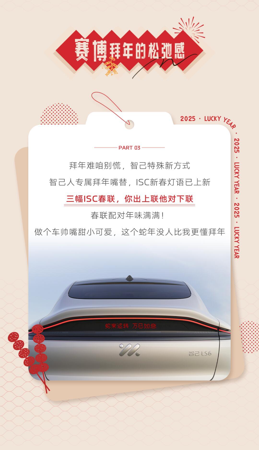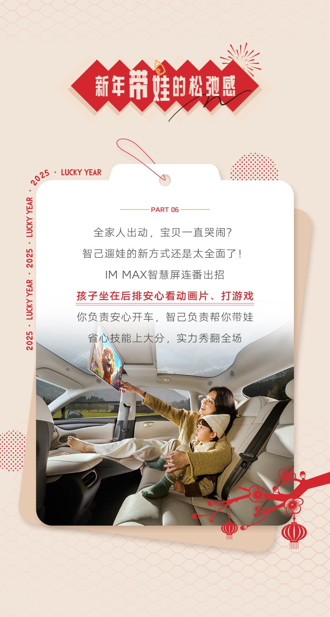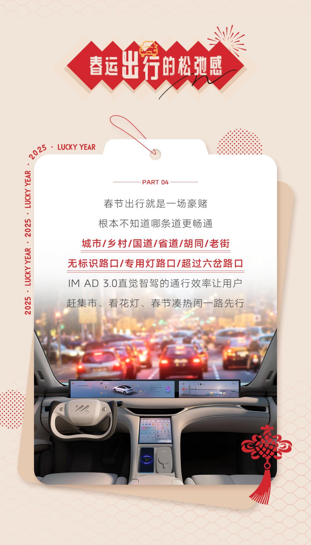 新春归程,智己伴你从容赴团圆 年关将至,年味渐浓,每一份奔赴团圆的心意,都值得被温柔守护。春运路上的续航焦虑、长途驾驶的疲惫困顿、老家窄巷的泊车难题,曾是无数人春节出行的烦心事。而这个新春,有智己相伴,从跨省返乡到走亲访友,每一段路途都能尽享从容,让团圆之路只剩温馨与惬意。 从容出行,始于续航无忧。春节自驾最怕低温续航缩水、高速充电排队,智己以硬核实力打破顾虑。搭载恒星超级增程系统的车型,综合续航超1500km,即便-1℃低温环境下全程开暖风、高速匀速行驶,续航达成率仍超85%,跨省返乡仅需一次补能便能直达。800V超快充更显贴心,15分钟补能310km,服务区买杯热饮、稍作休整的功夫,便能满电再出发,彻底告别充电排队的煎熬。更值得信赖的是,准900V电池包十万台交付零自燃,搭配低温畅行模式,即便-20℃严寒,北方车友也能放心启程,不用再紧盯电量表忧心忡忡。 从容出行,贵在智能减负。春节高速堵车是常态,长时间握方向盘、频繁踩刹换挡,难免身心俱疲。智己IM AD3.0智能驾驶系统,堪称长途出行的“神仙副驾”,安全水平更是达到人驾的6.7倍。高速开启智驾模式,车辆能自动跟车、居中行驶,遇到大型车辆主动避让,拥堵路段精准完成加减速,无需全程紧绷神经,双脚得以解放,大幅减轻驾驶疲劳。900多公里的返乡路,中途仅需一次休整,到家时依旧精神饱满,不用再因路途奔波错失与家人相聚的兴致。全场景AEB功能覆盖8-130km/h宽速域,突发状况下精准识别障碍物并秒刹,携老带幼出行,安全感拉满。 从容出行,赢在适配全场景。春节出行既要跑高速,也要走老家窄巷、停老旧小区刁钻车位,智己用灵活操控与宽敞空间完美适配。灵蜥底盘搭配双向24°四轮转向,近5米的车身转弯半径比肩小车,窄巷会车一把过,集市拥堵路段穿梭丝滑,新手也能轻松驾驭。一键泊车功能更是解决泊车难题,无需他人指挥,系统自动识别车位、精准入库,彻底告别泊车尴尬。大五座布局宽敞舒适,NAPPA真皮座椅自带按摩功能,老人孩子久坐也不觉得累;超大后备箱轻松装下全家行李、年货与走亲礼品,搬家式返乡也毫无压力。多孩家庭可选六座车型,全尺寸空间搭配冷暖冰箱、高端音响,宛如移动的豪华会客厅,走亲访友更有面儿。 更让人安心的是,智己春节服务不打烊,7×24小时道路救援在线,车机一键呼叫,附近技师最快30分钟抵达,即便途中遇到车辆问题,也能快速解决,全程无忧。 新春启程,不负归途。智己以续航、智能、操控的硬核实力,化解春节出行的种种痛点,用贴心服务筑牢安心防线。这个春节,让智己相伴,从容出发、安心归家,把路途的奔波化作团圆的铺垫,让每一次出行都满是暖意,每一场团圆都尽享圆满。
