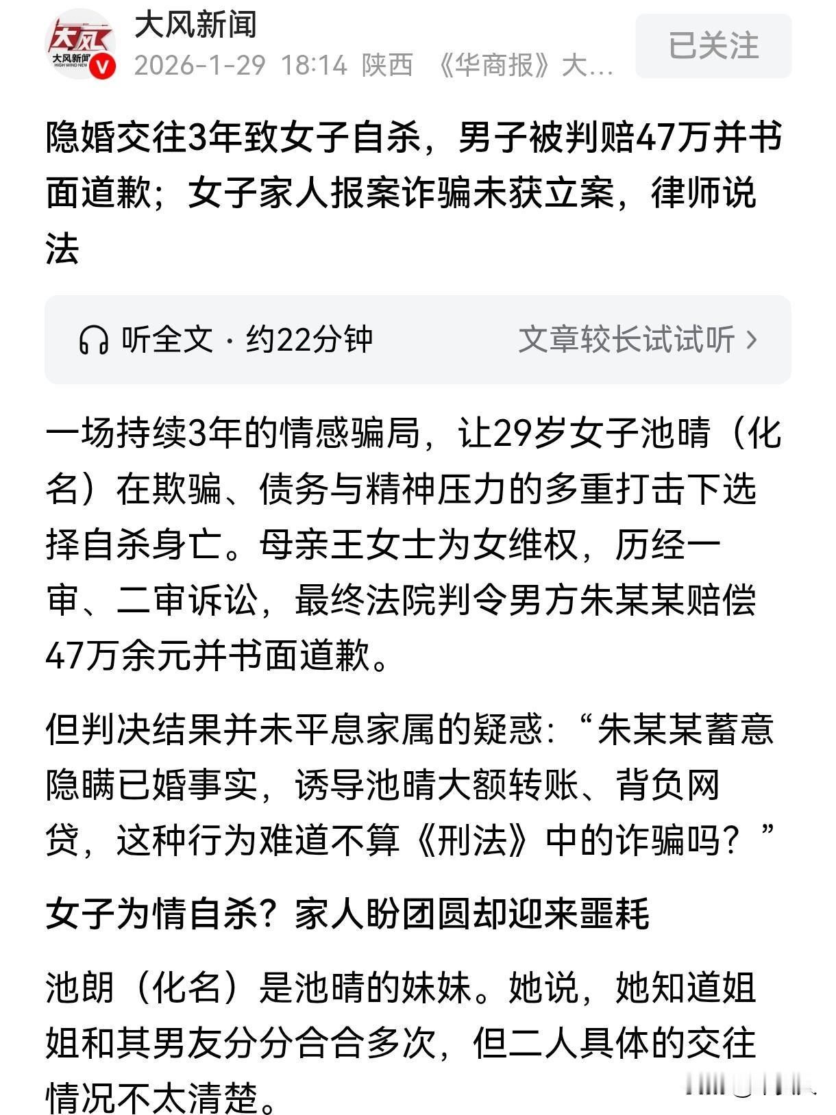 令人发指!湖北一男子,说自己单身,是做工程的,跟25岁女子相亲,带女子见自己家人和亲友,说会跟女子结婚生子,女子信以为真,把自己20万积蓄给对方拿去周转,又替男子借了30万网贷。之后女子发现男子早已经结婚生子,还和多人保持暧昧关系,并且对方还将自己裸照发给朋友,女子崩溃分手,并让朋友传话,可男子没有丝毫愧疚,还言语侮辱刺激她,女子崩溃结束了自己的生命。女子母亲将对方告上法庭,索赔140万元。可结果却让他们失望。 2024年1月25日,迟朗和母亲接到警方电话,说她姐姐迟晴在南昌的出租房里结束了自己的生命。 事发后,迟朗从姐姐留下的遗书中找到了姐姐走向极端的原因,姐姐把自己的死亡指向了其男友朱某某。 2021年3月,25岁的迟晴带着结婚的憧憬,经朋友介绍,结识了来自湖北阳新的朱某某,朱某某自称单身未婚未育,在昆明承包工程,将自己包装成可靠的结婚对象。 为获取信任,朱某某第一次约会就带迟晴见了兄嫂,不久后又带她回湖北老家见亲友,还许下结婚生子、共同创业的承诺,迟晴放下心防,和他正式交往。 恋爱第三个月,迟晴意外怀孕,可朱某某并未实现结婚生子的承诺,而是劝说迟晴打掉了孩子,说两人年轻,以后还会有的。 之后朱某某多次以公司周转,要给下面的人发工资为由,让迟晴帮帮自己。 最开始的几次,朱某某都按时还了钱,还多给了迟晴一些利息什么的,让迟晴觉得他是一个信守承诺的人。 可慢慢的,朱某某只借不还,3年时间里,他从迟晴手中拿走了53万元,其中20万是迟晴十年打工的积蓄,剩下33万是他诱导迟晴借的网贷。 2024年1月,两人原本约定用迟晴的征信和朱某某的工抵房办理百万贷款去长沙创业,但1月15日凌晨,迟晴无意中翻看朱某某手机,发现他早已结婚生子,同时还和多人保持暧昧关系。 备受打击的迟晴拉黑了朱某某,选择分手。 分手之后,迟晴通过共同好友传话,希望朱某某还钱,朱某某不仅毫无愧疚,反而不断辱骂刺激她,甚至发出“不死不是人”“送骨灰盒到外婆家”的威胁。 迟晴曾想报警求助,可帽子叔叔建议她去起诉处理。 此时的迟晴已经情绪崩溃了,她觉得自己已经没有精力去做这些事情了,她三次买了炭火又退单,还抱着希望要求朱某某道歉,却被朱某某拒绝。 最终,她彻底绝望,选择结束了自己的生命。 迟朗和母亲得知姐姐的遭遇后,心痛不已,决定替姐姐讨回一个公道。 随后,迟晴的母亲王女士将朱某某告上法院,要求其赔偿140余万元并公开道歉。 法院认为朱某某隐瞒已婚事实存在过错,但迟晴作为完全民事行为能力人需自行承担部分责任,一审判决朱某某承担30%责任,赔偿33万余元。 王女士不服上诉,二审法院纠正了朱某某只生育一女的错误信息,认定他实际育有一儿一女,并调整责任比例至45%,改判赔偿47万余元,同时要求朱某某以经法院审核的书面形式道歉,拒绝履行则需登报道歉。 可判决后,朱某某并未做出任何赔偿和道歉。 除了民事赔偿外,迟朗和母亲还希望能追究朱某某诈骗的刑事责任,可结果却让他们失望了,公安机关并未立案。 可他们并未放弃,一直都在为迟晴奔走,希望讨回公道。 从法律角度来说,该如何看待此事呢? 1、朱某某在已婚的情况下,谎称单身跟他人交往,违背了公序良俗。 《民法典》第8条规定:民事主体从事民事活动,不得违反法律,不得违背公序良俗。 朱某某在2011年就跟妻子登记结婚,婚后和妻子生育了一双儿女,夫妻之间有相互忠实的义务,可她隐瞒婚姻状况,和迟晴确立恋爱关系,并承诺以后跟她结婚生子,这种行为是不道德的,理应受到谴责。 2、朱某某是否需要承担刑事责任。 诈骗罪是指以非法占有为目的,用虚构事实或者隐瞒真相的方法,骗取数额较大的公私财物的行为。 认定诈骗罪需要满足几个关键条件:首先,行为人必须具有非法占有的主观目的,即从一开始就打算将被害人财物据为己有,没有归还意愿;其次,行为人实施了虚构事实或隐瞒真相的欺骗行为;最后,被害人是基于该欺骗行为产生错误认识,进而处分了自己的财物。 朱某某虽然隐瞒了已婚事实,但他和迟晴存在长期交往关系,前期借钱时也有按时归还并支付利息的行为,这让司法机关难以直接认定他从一开始就抱着骗钱不还的目的。 两人之间更像是恋爱期间的财务纠葛,而非纯粹的诈骗预谋,他的欺骗更多是为了维持不正当关系,但难以直接等同于以非法占有财物为核心目的的诈骗。 迟晴的遭遇令人痛心,朱某某的行为也毫无底线,令人发指。 恋爱交友,如果涉及到大额金钱来往,一定要谨慎处理,可以直接拒绝对方的要求。 如果发现自己被另一方欺骗,收集证据,用合法合规的途径去维护自己的的权益,千万不要去伤害自己,做亲者痛,仇者快的决定。 希望所有的女孩都能多爱自己一点,自尊自爱,自立自强,不要为了一些烂人烂事黯然神伤。