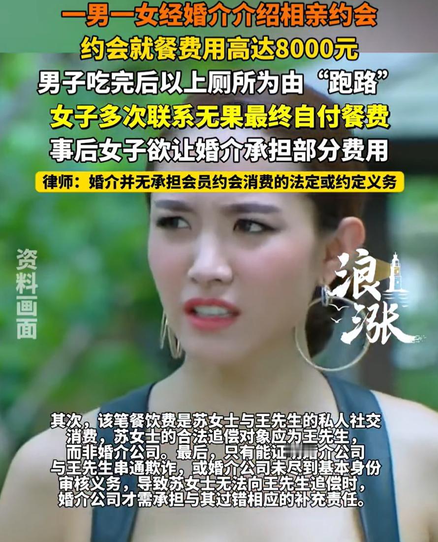 这下解释不清了!一女子在网上吐槽,她经过婚介介绍认识了一名相亲男子,两人第一次见面约在一个高档餐厅,谁知点了8000块餐品后,相亲男却借故逃单,女子买单后觉得委屈,想知道这件事婚介是否担责 事情本身并不复杂。苏女士通过婚介认识了王先生,第一次见面吃饭。菜是点了,酒也上了,价格一路往上走。等到结账前,男方说去趟卫生间,人就再也没回来,电话不接,消息不回,像人间蒸发 苏女士不想在餐厅闹得太难看,只能先把钱付了,事后越想越憋屈,就把经历发到网上,顺带问了一句:这事婚介要不要管 对此,不少网友也是议论纷纷,其中有一个说到了点上:看谁点的,男的点这么多还跑了,男的就是饭托,要是女的点的,男的遭不住跑了,那女的就自己买单呗 其实啊,类似这种相亲见面的消费问题,并不是个例。两个人第一次见面,彼此都不熟悉,对对方的消费习惯、经济情况也没底,这个时候如果约在消费较高的地方,确实容易尴尬 从情理上说,婚介所提供的只是一个认识的渠道,他们负责介绍双方认识,但后续两人如何相处、见面怎么安排,一般不在他们的服务范围里。除非婚介所明确承诺过会对约会消费负责,或者有证据表明他们和男方串通故意设局,否则很难要求他们来承担这笔餐费 另外,如果婚介明知道某个人存在频繁相亲、消费异常、被多次投诉的情况,还继续介绍,那它就不是完全无辜 由此可见,这笔钱该不该全由女方承担,不能一刀切。关键看点菜过程、是否有明显诱导、高消费是否由一方主导。如果能证明男方存在故意行为,那就该追究男方责任,婚介也有义务配合处理。如果只是一次失控的相亲,法律上可能很难追回