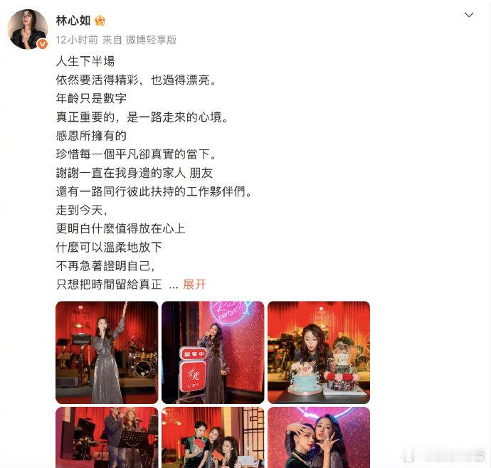 林心如 年龄只是数字 林心如发文庆祝五十岁生日,坦言年龄只是数字,人生下半场依然要活得精彩。生日会以她制片的《华灯初上》为主题,现场众星云集。林心如霍建华合唱庆生