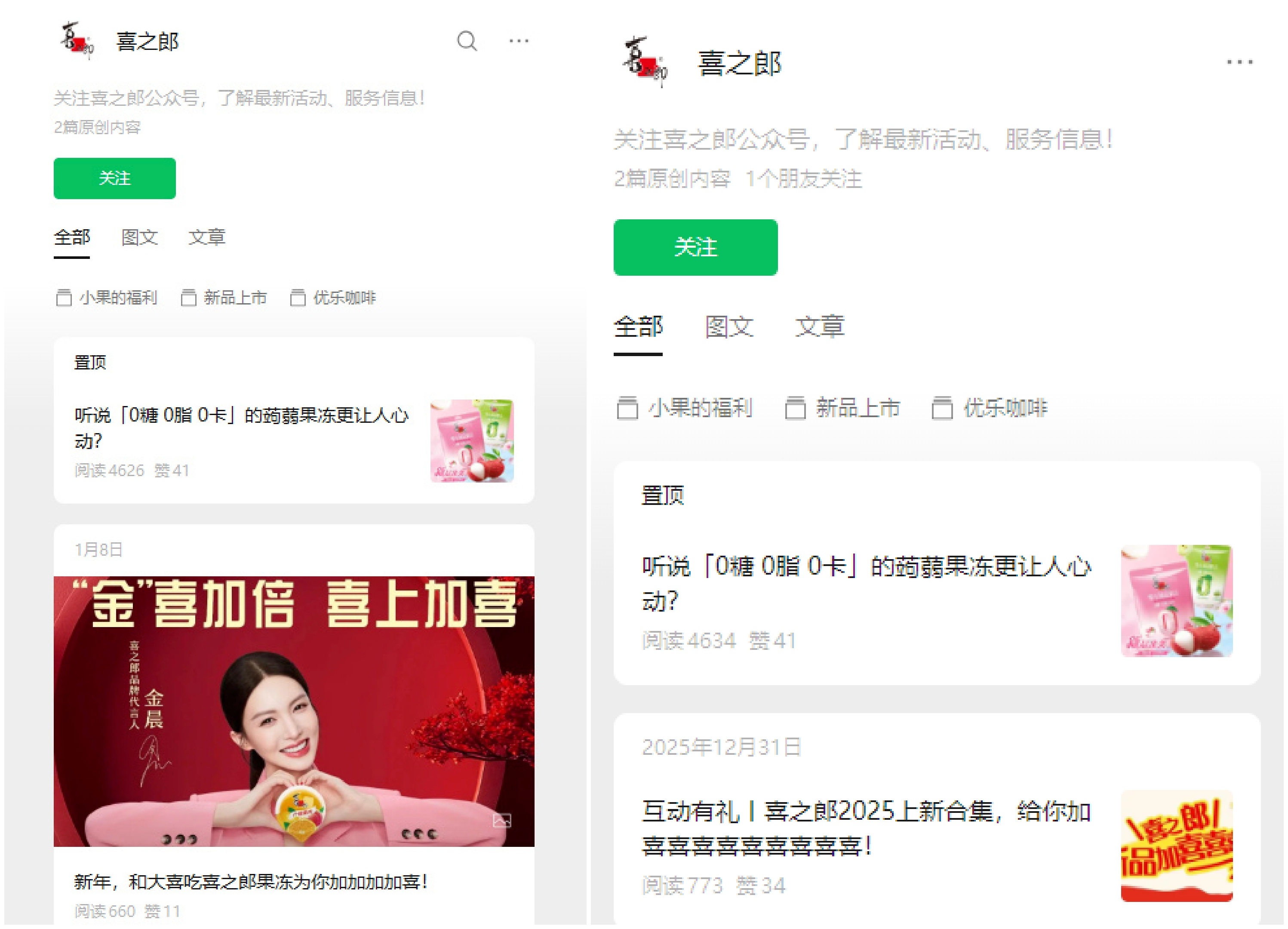 1月30日,曾官宣金晨为代言人的喜之郎果冻,其官方微博中所有金晨相关内容已删除。此前,该品牌微博置顶为1月7日发布的金晨代言宣传 内容。据悉,喜之郎官方微信公众号曾于1月8日发布一篇金晨相关推文,目前也已删除。