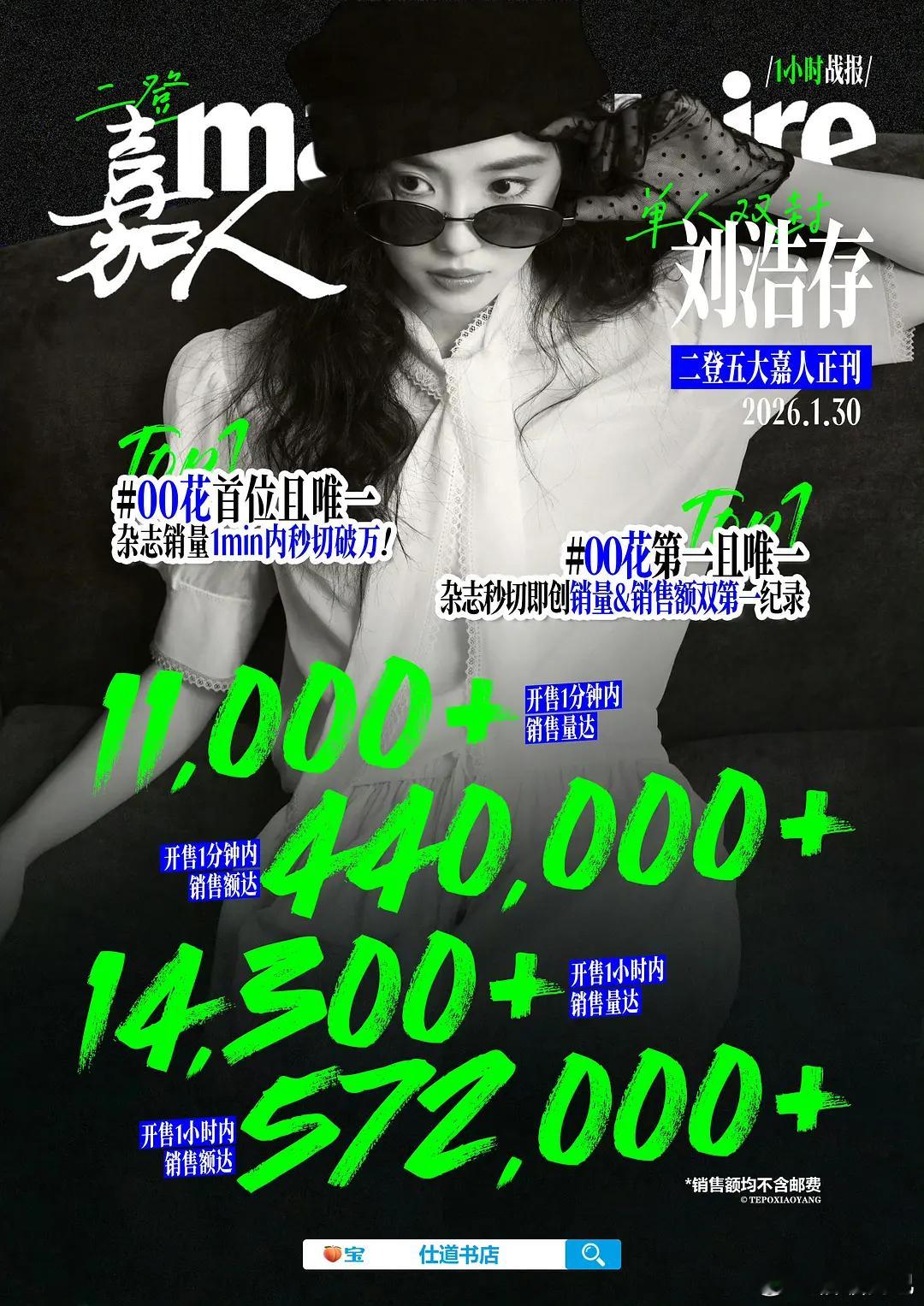 刘浩存嘉人一小时战报来了,00花第一目唯一杂志秒切即创销量&销售额双第一纪录