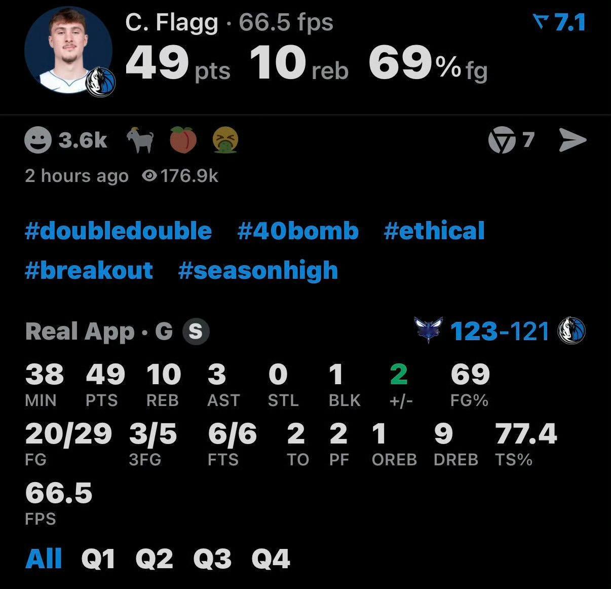 天赋拉满!19岁弗拉格49+10书写新秀封神时刻19岁弗拉格轰49分成最年轻先生!空砍封神仍见超巨胚子这就是状元的天赋!19岁库珀·弗拉格单场29中20狂砍49+10,硬生生刷爆NBA历史,成联盟最年轻49分先生,还打破独行侠队史新秀得分纪录,这波操作直接看呆所有人!首节球队挖坑他仅得2分,次节直接开启杀神模式,9投8中单节轰23分,一己之力把13分分差追至只剩1分,这得分爆发力哪像个新秀?三节砍40+,末节还能迎着防守扔进绝平三分,弗拉格把锋线的得分手段玩得明明白白,突破、中投、三分样样有,效率高得离谱。可惜独行侠全队拉胯,只剩他孤军奋战,最后时刻的致命失误让胜利溜走,49分终究成了空砍。但你得承认,这孩子的天赋肉眼可见,攻防一体的底子,关键时刻的大心脏,才19岁就有这统治力,这绝对是联盟未来的超巨苗子!弗拉格最年轻49分先生黄蜂战胜独行侠nba弗拉格
